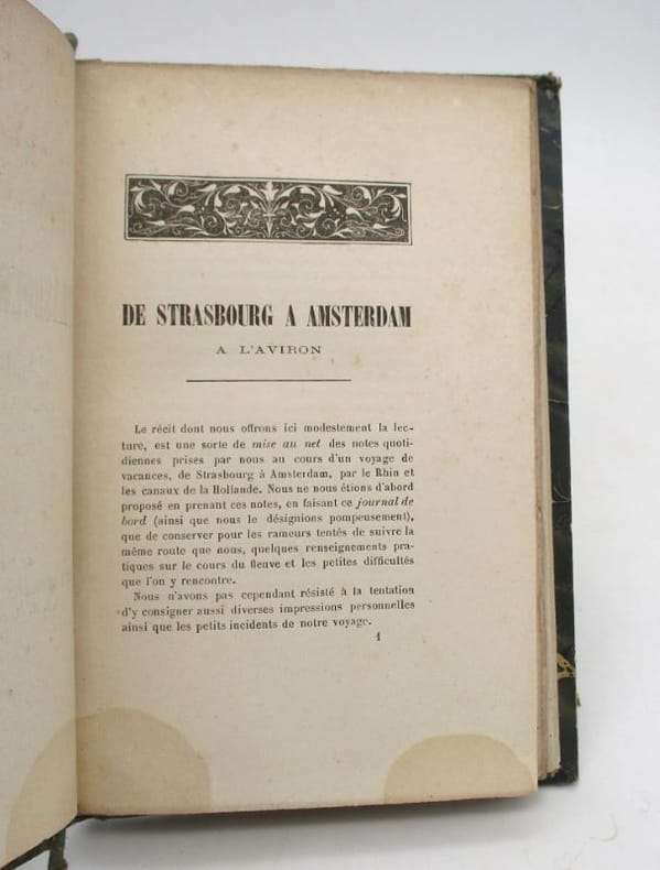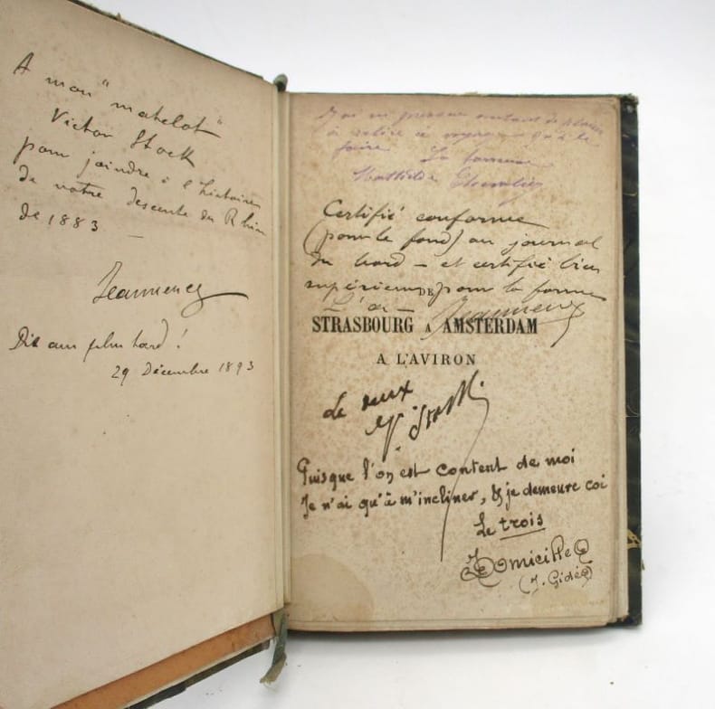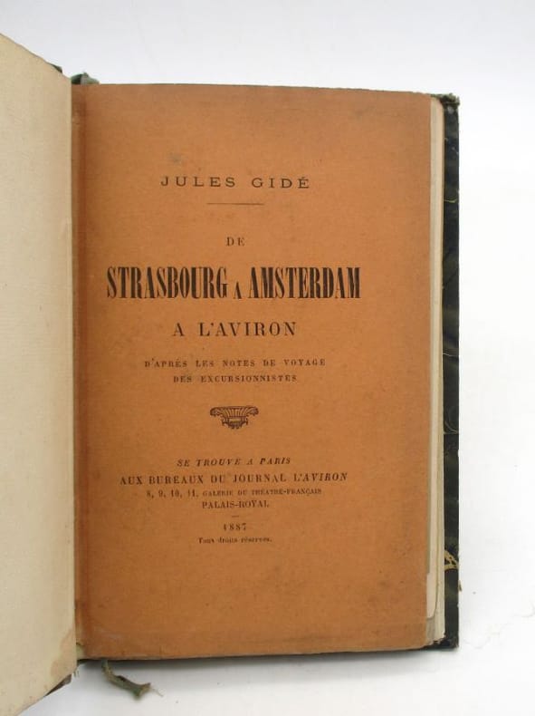 Édition originale en volume qui a auparavant paru dans le revue L'Aviron. Cet exemplaire comporte des envois autographes signés des membres de l'équipage (Charles Jannenay, Mathilde Chevalier et Jules Gidé) à Victor Stock qui fut aussi du voyage. Il comprend également une photographie en tête de l'ouvrage, probablement un portrait de Charles Jannenay avec un envoi signé à Stock. Enfin celui-ci a signé son propre exemplaire au faux-titre. * Membre du SLAM et de la LILA / ILAB Member. La librairie est ouverte du lundi au vendredi de 14h à 19h. Merci de nous prévenir avant de passer,certains de nos livres étant entreposés dans une réserve.