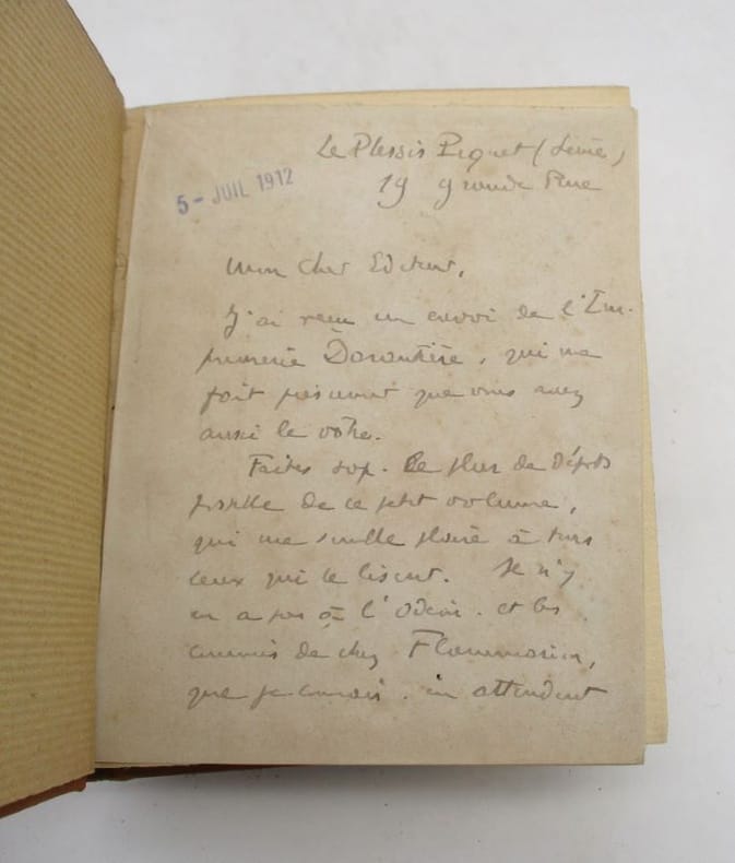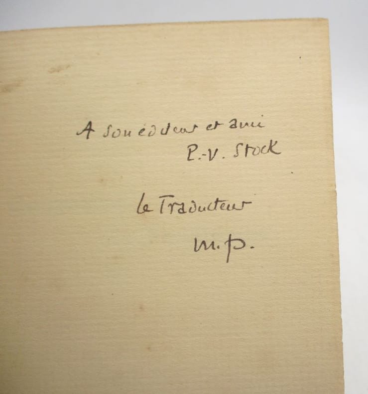 Édition traduite par Martin Petitclerc. Exemplaire partiellement coupé et comportant un envoi autographe signé du traducteur à son éditeur P.-V. Stock ainsi qu'une lettre autographe signée de Petitclerc (1 p. 1/2 in-12, datée du 5 juillet 1912) au même, à propos de la présente publication. * Membre du SLAM et de la LILA / ILAB Member. La librairie est ouverte du lundi au vendredi de 14h à 19h. Merci de nous prévenir avant de passer,certains de nos livres étant entreposés dans une réserve.