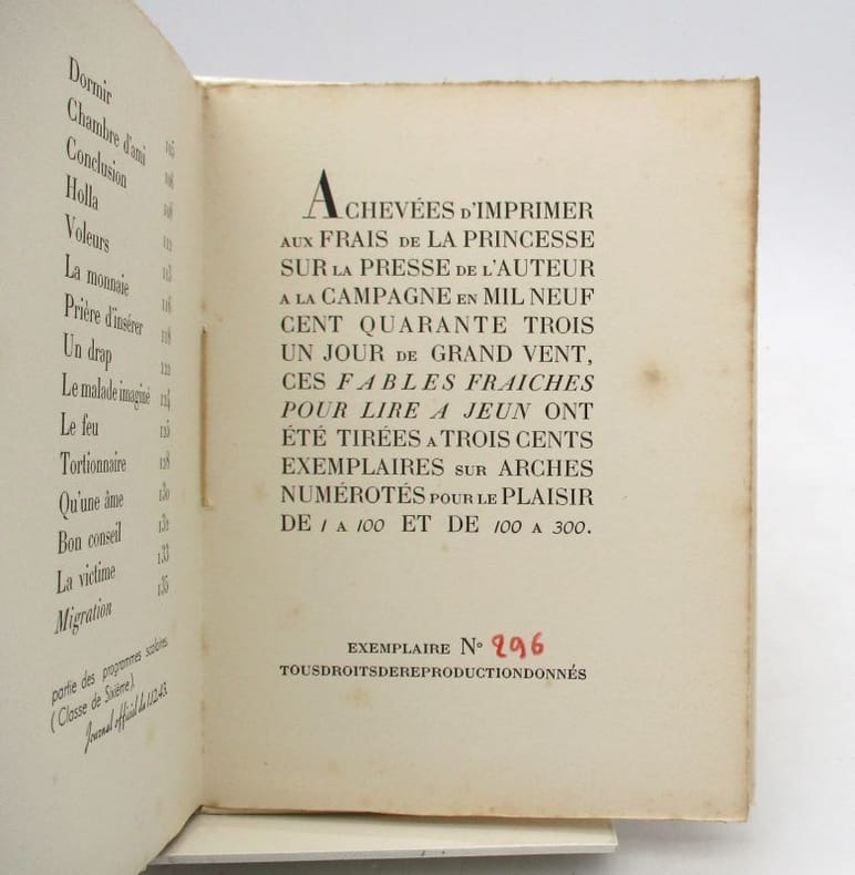 ed. Chez l’auteur 1943 "in-12 br., couv. rempliee, edition originale numerotee sur Arches (seul papier), tirage limite à 300 ex., jaquette avec cette citation ""sous le voila chatoynt de la fantaisie, que de pensees profondes… Et la poesie est partout"""