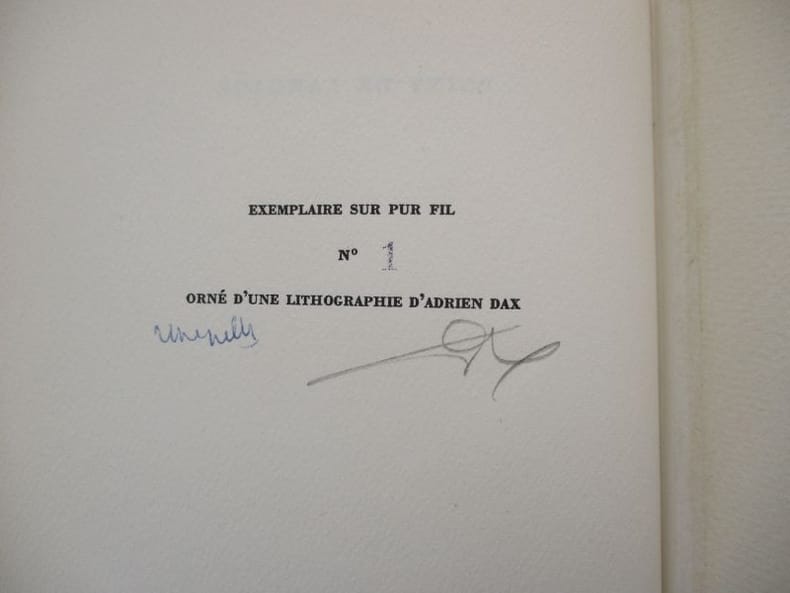 Édition originale illustrée d'une lithographie en couleurs d'Adrien Dax. Premier exemplaire sur pur fil, signé à la justification par l'auteur et l'artiste, cet exemplaire est accompagné d'une carte postale autographe signée de l'auteur. * Membre du SLAM et de la LILA / ILAB Member. La librairie est ouverte du lundi au vendredi de 14h à 19h. Merci de nous prévenir avant de passer,certains de nos livres étant entreposés dans une réserve.