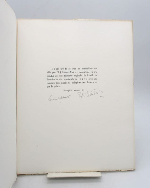 Édition originale illustrée d'une peinture originale. Un des 60 exemplaires sur vélin pur fil Johannot, signé à la justification par l'auteur et l'artiste. * Membre du SLAM et de la LILA / ILAB Member. La librairie est ouverte du lundi au vendredi de 14h à 19h. Merci de nous prévenir avant de passer,certains de nos livres étant entreposés dans une réserve.