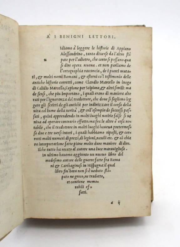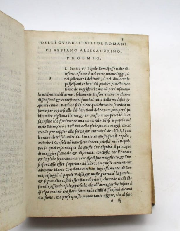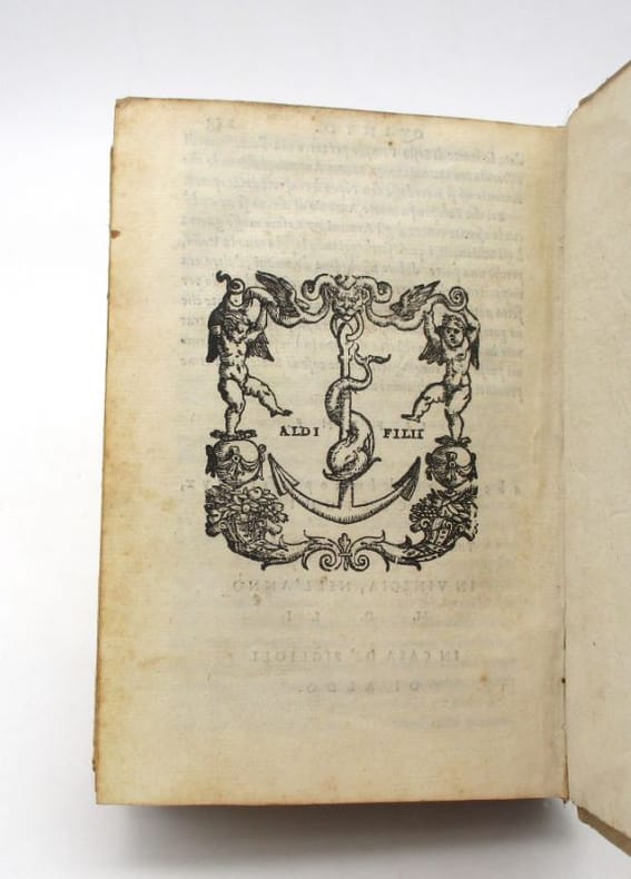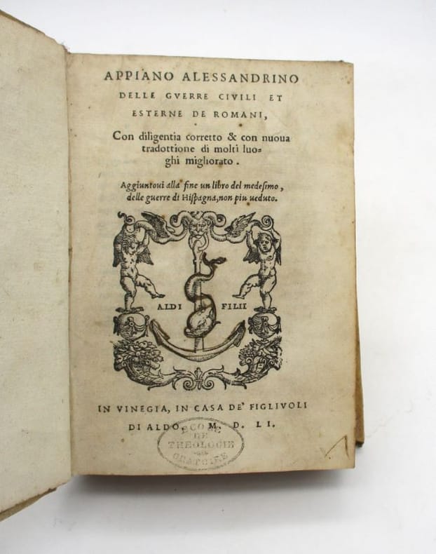 Seconde édition aldine de la première partie (en cinq livres) de la traduction en italien d'Alessandro Braccesi faite d'après le texte latin édité par Pier Candido Decembrio. L'éditeur, Paul Manuce y a porté de nombreuses corrections faites à partir des manuscrits grecs, la rendant ainsi plus complète et plus juste. Elle comporte deux belles marques de l'imprimeur, la fameuse ancre aldine, au titre et au dos du dernier feuillet. Une main ancienne a repassé à l'encre la première marque. Peu commun. Brunet, I, 134; Renouard, I, p. 314. Tampon ex-libris de l'école de théologie de l'Oratoire. * Membre du SLAM et de la LILA / ILAB Member. La librairie est ouverte du lundi au vendredi de 14h à 19h. Merci de nous prévenir avant de passer,certains de nos livres étant entreposés dans une réserve.
