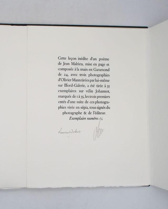 Édition originale illustrée de 3 photographies originales en noir et blanc. Un des 35 exemplaires tirés sur Johannot, unique tirage annoncé, signé par l'éditeur et l'artiste à la justification. * Membre du SLAM et de la LILA / ILAB Member. La librairie est ouverte du lundi au vendredi de 14h à 19h. Merci de nous prévenir avant de passer,certains de nos livres étant entreposés dans une réserve.