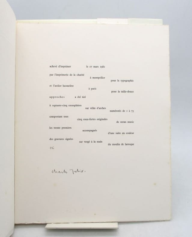 Édition originale illustrée de 5 eaux-fortes originales dont la première est signée et justifiée par l'artiste. Un des exemplaires hors commerce tirés sur vélin d'Arches, signé à la justification par l'auteur. * Membre du SLAM et de la LILA / ILAB Member. La librairie est ouverte du lundi au vendredi de 14h à 19h. Merci de nous prévenir avant de passer,certains de nos livres étant entreposés dans une réserve.