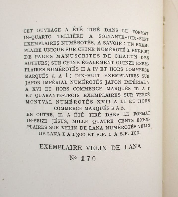 Édition originale. Un des 1400 exemplaires sur vélin de Lana. * Membre du SLAM et de la LILA / ILAB Member. La librairie est ouverte du lundi au vendredi de 14h à 19h. Merci de nous prévenir avant de passer,certains de nos livres étant entreposés dans une réserve.