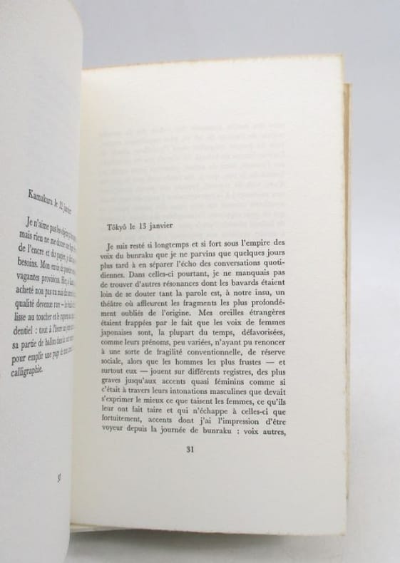 Orné d'une gravure originale d'Arpad Szenes, justifiée 35/40 et signée par l'artiste à la mine de plomb. Édition originale tirée à 640 exemplaires, celui-ci un des 40 de tête sur vélin pur fil Johannot (35), comportant une gravure originale. "Sous la forme d’un journal de voyage au Japon, dédié à Tamotsu Yato, le photographe des nus, ce récit drôle, piquant, poétique, entraîne le lecteur des bains traditionnels aux échoppes de tatoueurs, sans oublier les temples et les jardins." catalogue de l'éditeur.