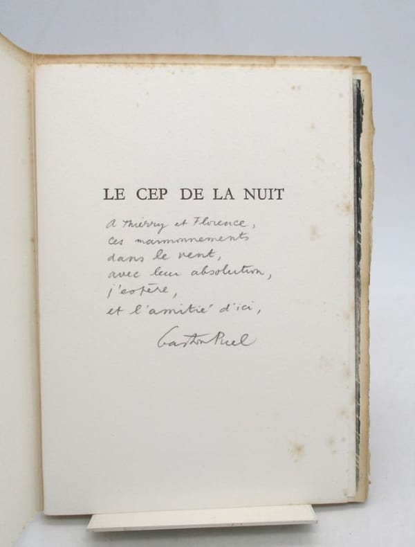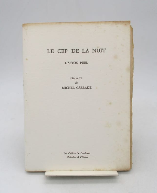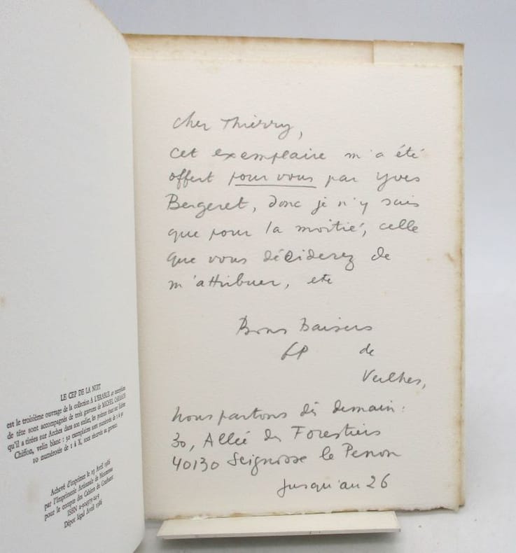 Édition originale illustrée de trois gravures signées par l'artiste. Cet exemplaire, tiré sur Johannot mais non justifié, comporte deux envois autographes signés de l'auteur à l'éditeur et écrivain Thierry Bouchard. * Membre du SLAM et de la LILA / ILAB Member. La librairie est ouverte du lundi au vendredi de 14h à 19h. Merci de nous prévenir avant de passer,certains de nos livres étant entreposés dans une réserve.