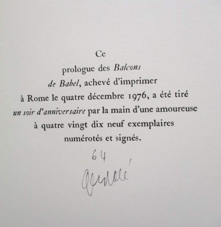 Édition originale. Un des 99 exemplaires tirés, seul tirage annoncé, signé à la justification par l'auteur. * Membre du SLAM et de la LILA / ILAB Member. La librairie est ouverte du lundi au vendredi de 14h à 19h. Merci de nous prévenir avant de passer,certains de nos livres étant entreposés dans une réserve.
