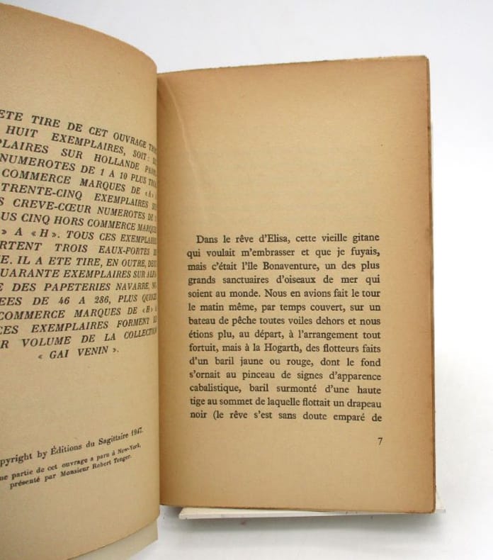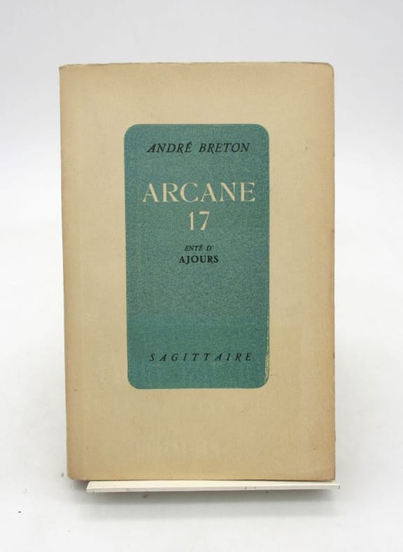 Edition en partie originale, les Ajours paraissant ici pour la première fois. Tirage à 308 exemplaires numérotés. Un des 40 sur Marais Crève-coeur, ici numéroté - signés à l'encre verte par André Breton et comportant hors texte 3 EAUX-FORTES originales de Maurice BASKINE, chacune signée. >Bel exemplaire en grande partie non coupé. Inséré le bandeau du tirage courant:" André Breton Le livre attendu suivi d'Ajours". ----- A son retour à Paris en mai 1946, André Breton est assez pressé de voir publier en France ARCANE 17 qui avait paru premièrement à New York en décembre 1944 chez Brentano's. L'écrivain avait rédigé son manuscrit d'août à septembre alors qu'il était en voyage en Gaspésie au Québec avec Elisa Claro qui allait devenir sa femme, et à qui il dédie son texte qu'il élabore sur un cahier d'écolier comme un véritable livre-objet, y mêlant différents collages d'images ou d'objets tels une feuille d'arbre. Et Breton place cette nouvelle oeuvre sous le signe de l'étoile, "...emblème de l'espérance et de la résurrection..." telle qu'on la voit sur la dix-septième lame de tarot. Arrivé à Paris Breton tente d'insuffler au mouvement cet élan de vitalité en organisant une nouvelle exposition internationale surréaliste à la galerie Maeght, et en publiant conjointement ce texte qu'il augmente d'Ajours. Il demande alors à Maurice Baskine lui aussi fasciné par l'alchimie et l'occultisme d'illustrer de gravures symboliques le tirage de tête du livre. Très bon 0