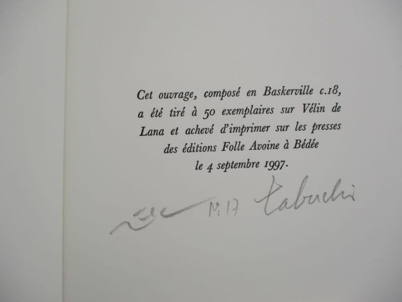 Édition originale illustrée 3 gravures sur bois de Yasse Tabuchi. Un des 50 exemplaires tirés sur vélin de Lana, unique tirage annoncé, signé à la justification par l'auteur et l'artiste. * Membre du SLAM et de la LILA / ILAB Member. La librairie est ouverte du lundi au vendredi de 14h à 19h. Merci de nous prévenir avant de passer,certains de nos livres étant entreposés dans une réserve.