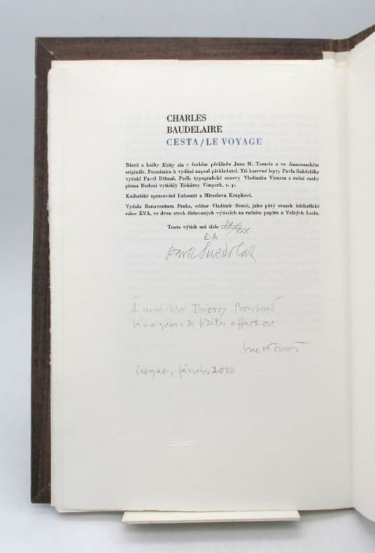 Édition traduite en tchèque du poème de Baudelaire illustré des gravures en couleurs de l'artiste Jan M. Tomes. Cet exemplaire comporte un envoi autographe signé de l'artiste à l'éditeur et auteur Thierry Bouchard. * Membre du SLAM et de la LILA / ILAB Member. La librairie est ouverte du lundi au vendredi de 14h à 19h. Merci de nous prévenir avant de passer,certains de nos livres étant entreposés dans une réserve.