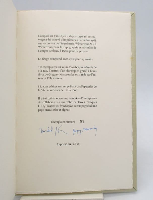 Albeuve, Castella 1968, 265x170mm, 58pages, broché. Edition limitée à 1000 exemplaires. Exemplaire sur papier vélin d’Arches, numéroté n.° 65 / 120, signé par l’auteur et l’illustrateur et illustré d’un frontispice gravé à l’eau-forte de Gregory Masurovsky. Sous emboîtage cartonné. Exemplaire à l'état de neuf.