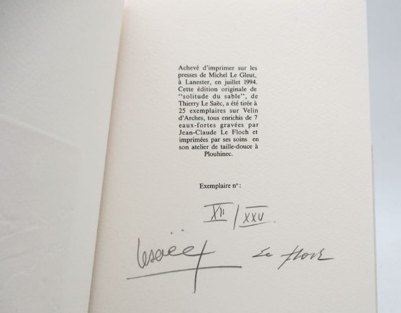 Édition originale illustrée de 7 eaux-fortes dont 6 signées par l'artiste. Un des 25 exemplaires tirés sur vélin, unique tirage annoncé, signé à la justification par l'auteur et l'artiste. * Membre du SLAM et de la LILA / ILAB Member. La librairie est ouverte du lundi au vendredi de 14h à 19h. Merci de nous prévenir avant de passer,certains de nos livres étant entreposés dans une réserve.