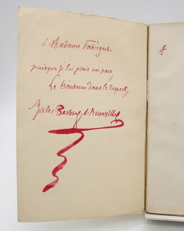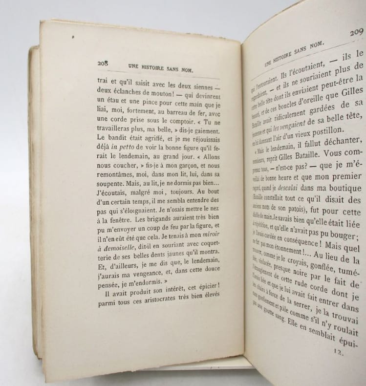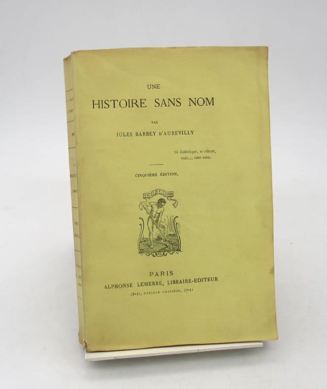 vol relié in12, 150x100, très bel état intérieur, 259pp. reliure d'Art Queruel, Roubaix Paris, Alphonse Lemerre, ss date vers 1900 "Une histoire sans nom" est un recueil de nouvelles publié en 1882. Ce recueil explore les thèmes de l'amour, de la passion, de la fatalité et de la violence. Les histoires contenues dans ce recueil sont sombres et souvent empreintes de mystère, caractéristiques du style gothique et romantique de l'auteur. "Dans une page d'histoire" est un roman historique publié en 1843. L'histoire se déroule pendant la Révolution française et met en scène des personnages historiques tels que Maximilien de Robespierre. Le roman examine les événements tumultueux de la Révolution et les conséquences qui en découlent. Les deux œuvres sont représentatives du style flamboyant et provocateur de Jules Barbey d'Aurevilly, connu pour son exploration des passions humaines et des extrêmes émotionnels. ref/151
