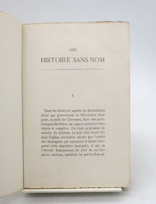 en frontispice, portrait de l' auteur Complet un volume sous emboîtage, 28x20, feuillets repris dans chemise avec jaquette, état neuf, 178pp, avec son étui cartonné. Exemplaire n°15/1000 sur papier bouffant de Hollande spécialement fabriqué pour cette édition. Edition J.L Kellinckx, 1958. Collection " A travers le temps " "Une histoire sans nom" est un recueil de nouvelles publié en 1882. Ce recueil explore les thèmes de l'amour, de la passion, de la fatalité et de la violence. Les histoires contenues dans ce recueil sont sombres et souvent empreintes de mystère, caractéristiques du style gothique et romantique de l'auteur. "Dans une page d'histoire" est un roman historique publié en 1843. L'histoire se déroule pendant la Révolution française et met en scène des personnages historiques tels que Maximilien de Robespierre. Le roman examine les événements tumultueux de la Révolution et les conséquences qui en découlent. Cette œuvre est représentative du style flamboyant et provocateur de Jules Barbey d'Aurevilly, connu pour son exploration des passions humaines et des extrêmes émotionnels.