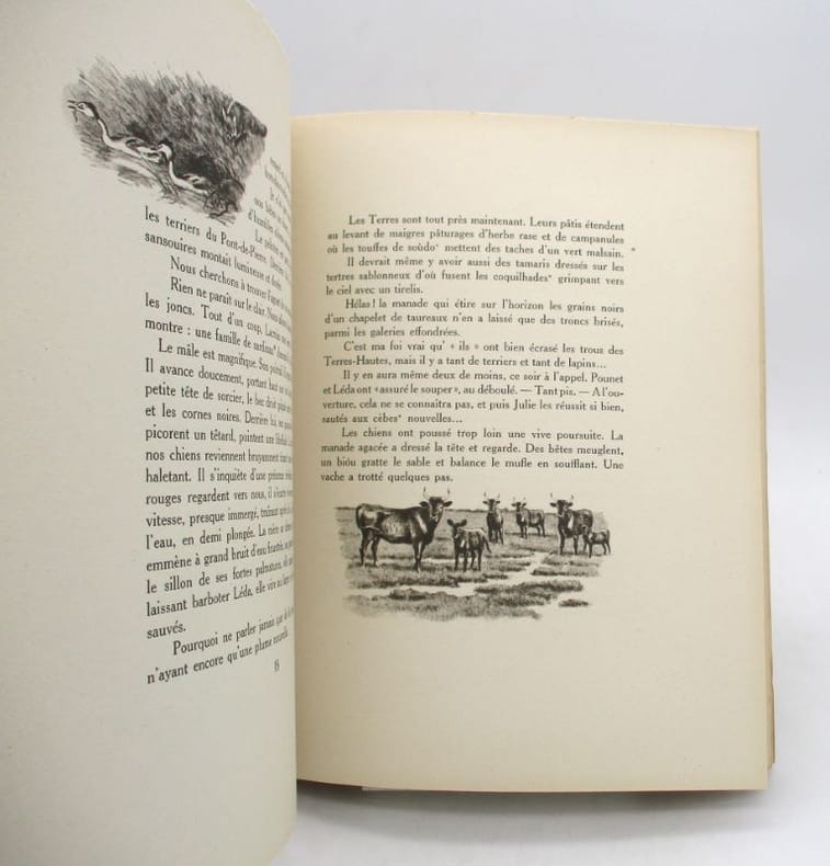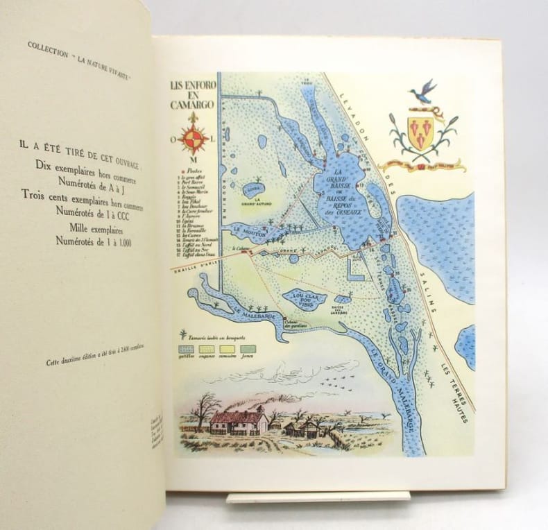 Rennes-Paris, Soc. Anonyme des Imp. Oberthur, 1945. Coll. "La Nature vivante". In-4 broché, 139 p. Précédé d'un avant-propos en provençal de Marius Conte-Devolx, traduit. 70 ill. de J. Oberthur et 1 carte h.-t. en couleurs. E.O. Exemplaire N° 949 / 1000. Très bon état : rares rousseurs.La Camargue à travers les saisons.