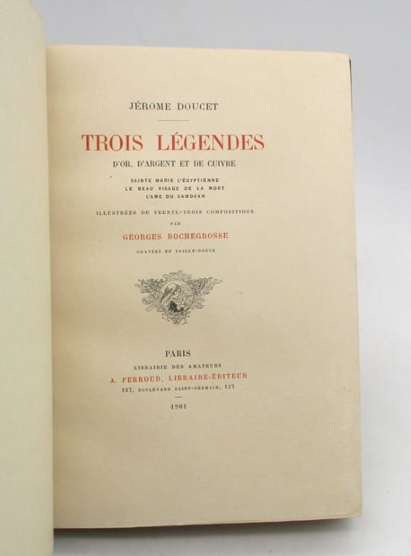 Librairie Des Amateurs - A. Ferroud Libraire-Editeur Paris 1901 In-8 ( 250 X 175 mm ) de 121 pages, broché sous couverture imprimée rempliée. Compositions gravées à l'eau-forte dans et hors texte par Georges ROCHEGROSSE. Tirage à 350 exemplaires, celui-ci N°23 , 1 des 60 sur Japon contenant une suite en noir des illustrations. Bel exemplaire.