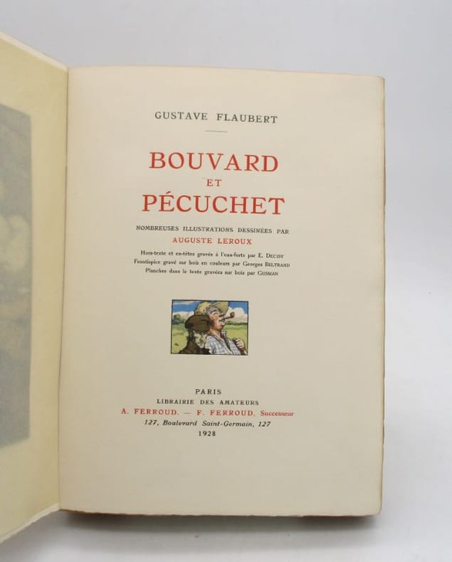 Edition originale du dernier roman de Flaubert. L’un des 55 exemplaires sur papier de Hollande, « de plus en plus recherché, particulièrement en grand papier ». Clouzot, 122 Carteret, 270 ; Rahir, La Bibliothèque de l’amateur, 427. Exemplaire cité par Vicaire (III, 733) : « sur papier de Hollande, en demi-maroquin vert, non rogné, avec la couverture, 26 fr. Bouret ». Dans cette satire mordante conçue à la fin de sa vie et restée inachevée, Flaubert s’attaque violemment à l’esprit bourgeois et à la vanité intellectuelle fort répandue à son époque et en particulier au culte de la science et à la critique de « ceux qui croient savoir et n’ont même pas appris à apprendre ». Certains des passages ne sont pas sans faire penser à l’expression vengeresse de Léon Daudet : ‘le stupide XIXe siècle’. L’écrivain écrivait d’ailleurs dans une lettre à Raoul-Duval en 1879 : « L’ouvrage que je fais pourrait avoir comme sous-titre : ‘Encyclopédie de la Bêtise humaine’ ». « Le livre ne manque ni d’épisodes amusants, ni d’inventions savoureuses. Le premier chapitre bien que teinté d’une ironie quelque peu féroce, n’en est pas moins un hymne à l’amitié entre ces deux copistes Bouvard et Pécuchet qui se découvrent des goûts communs et achètent à la campagne, avec l’héritage de Bouvard, une propriété qu’ils entendent faire fructifier, eux-mêmes. Les chapitres suivants sont d’une vivacité et d’une justesse de ton admirables ». Déçus de tous leurs insuccès ils se remettront à copier ce que Flaubert n’a pas eu le temps de rédiger : ce que les deux amis copiaient pour leur plaisir, peut-être le sottisier des grands et petits écrivains qu’ils s’amusaient précisément à composer ou bien le ‘Dictionnaire des idées reçues’ recueil de sentences conventionnelles recueillies par le romancier… Bel exemplaire de cette édition originale recherchée, l’un des 55 imprimés sur papier de Hollande, relié à l’époque à toutes marges avec ses couvertures jaunes imprimées conservées.