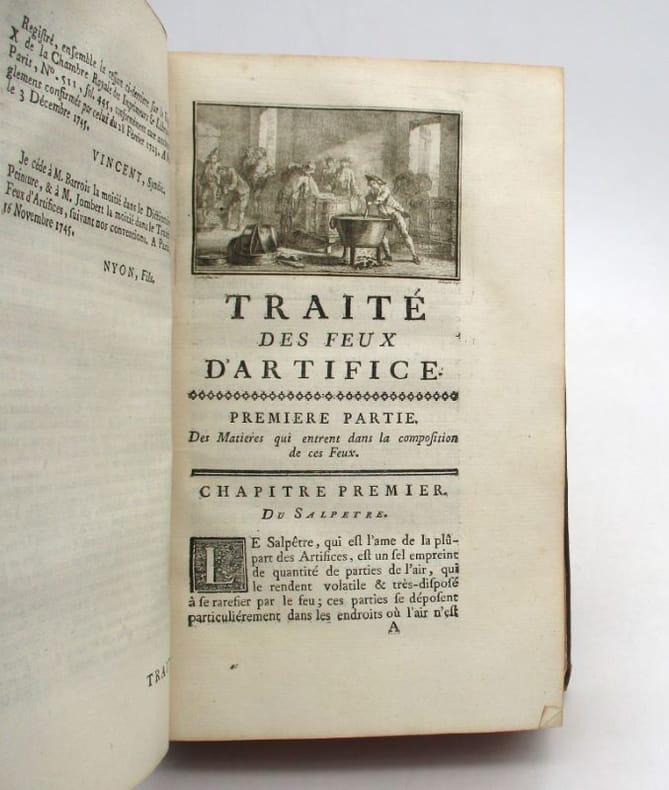 Seconde édition entièrement refondue par F. Frezier, officier du Génie et élève de Perrinet d'Orval. La première édition, publiée sous le titre Essai sur les feux d'artifice, avait été imprimée en 1745. C'est le meilleur ouvrage publié au XVIIIe siècle sur ce sujet. Il servit de base aux articles de l'Encyclopédie traitant de la pyrotechnie. Bel exemplaire. Quérard VII, 69; Barbier IV, 780.