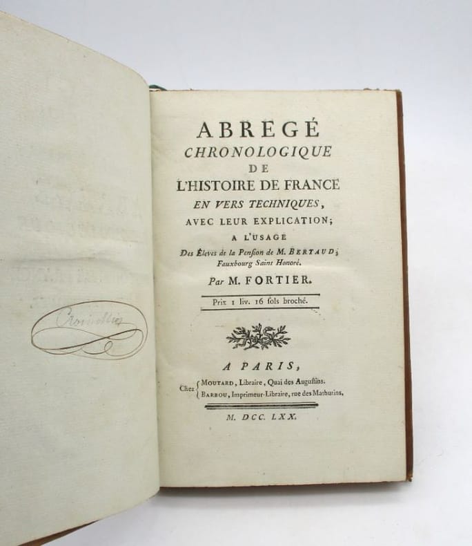 Nouvelle édition de cette méthode pour apprendre l'Histoire de France en vers. Elle comprend 3 tableaux chronologiques dépliants des Rois de France. * Membre du SLAM et de la LILA / ILAB Member. La librairie est ouverte du lundi au vendredi de 14h à 19h. Merci de nous prévenir avant de passer,certains de nos livres étant entreposés dans une réserve.