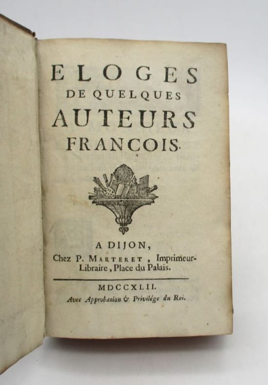 Édition originale peu commune de cet ouvrage composé de 12 éloges : celui de Montaigne est de la main de Bouhier, ceux de de Dalechamp et Méré de Michault et les autres de l'abbé Joly. Barbier, II, 92d. * Membre du SLAM et de la LILA / ILAB Member. La librairie est ouverte du lundi au vendredi de 14h à 19h. Merci de nous prévenir avant de passer,certains de nos livres étant entreposés dans une réserve.