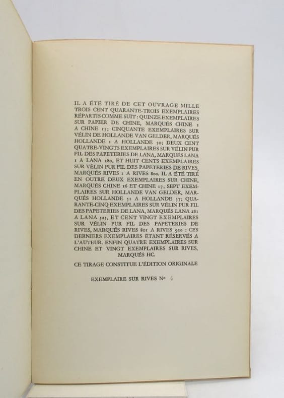 Édition originale, un des 800 exemplaires numérotés sur vélin pur fil des papeteries de Rives. Bon etat