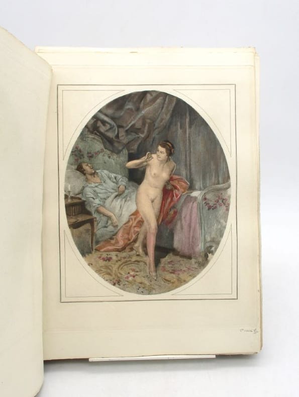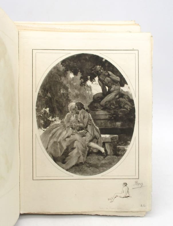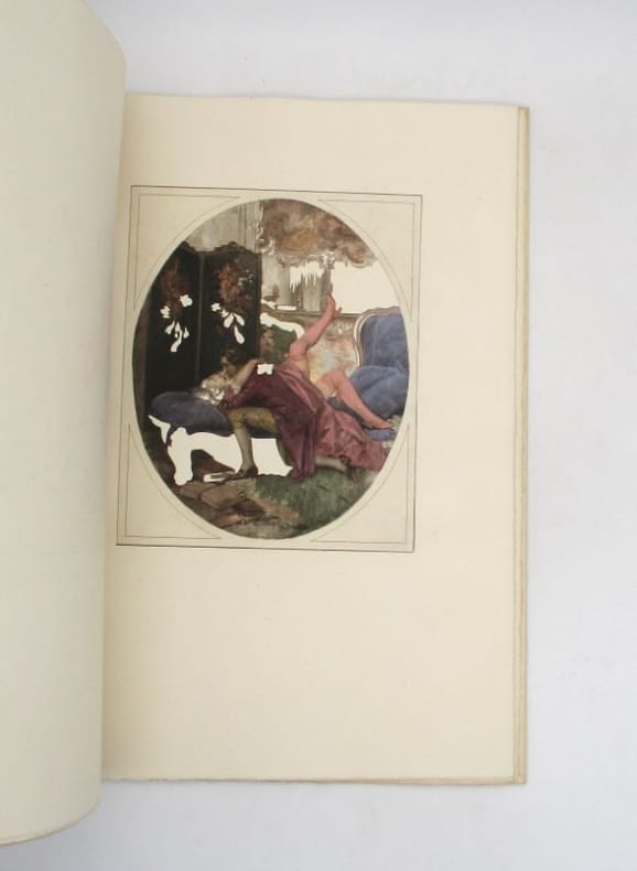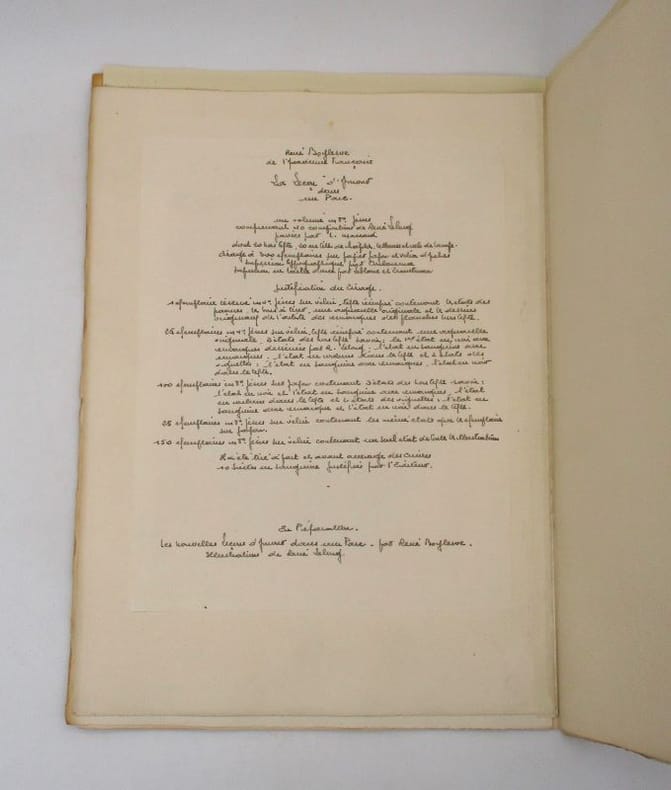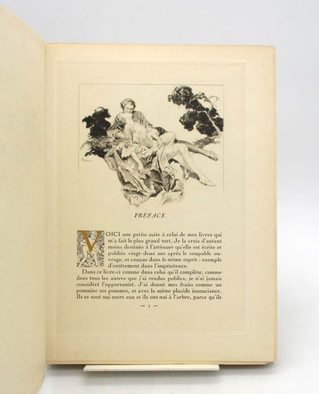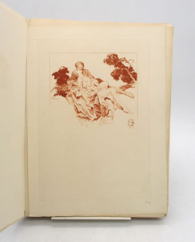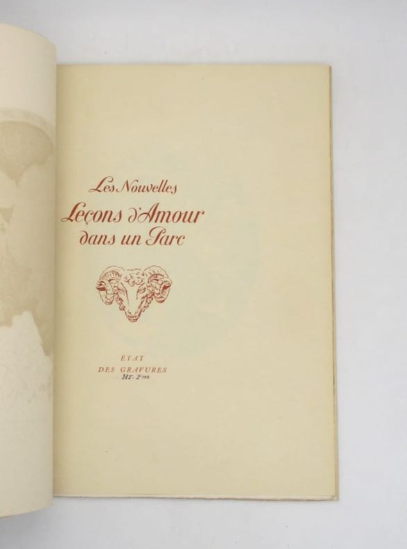 Exemplaire de l'éditeur (madame Romagnol) de cette édition illustrée des compositions en couleurs hors texte, des vignettes en noir et des ornements en noir et or de René Lelong. Un des 100 exemplaires in-4 réimposé sur Japon comprenant cinq suites des hors-textes dont deux sont numérotées et signées des initiales de l'imprimeur Angelo Ciavarri; ainsi que deux suites des vignettes dont une numérotée et signée par le même. Cet exemplaire est accompagné d'un volume de suites tiré pour l'éditeur comprenant plus de 230 planches d'états refusés, de mises en couleurs par l'artiste, de bons à tirer, d'échantillons du texte... la plupart signées par l'imprimeur, quelques unes par Lelong de ses initiales. Il comprend un second volume de suite de 49 planches en grand format ainsi que la décomposition d'une gravure en 12 planches tirées pour la suite de ce roman. * Membre du SLAM et de la LILA / ILAB Member. La librairie est ouverte du lundi au vendredi de 14h à 19h. Merci de nous prévenir avant de passer,certains de nos livres étant entreposés dans une réserve.