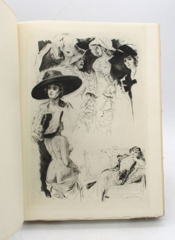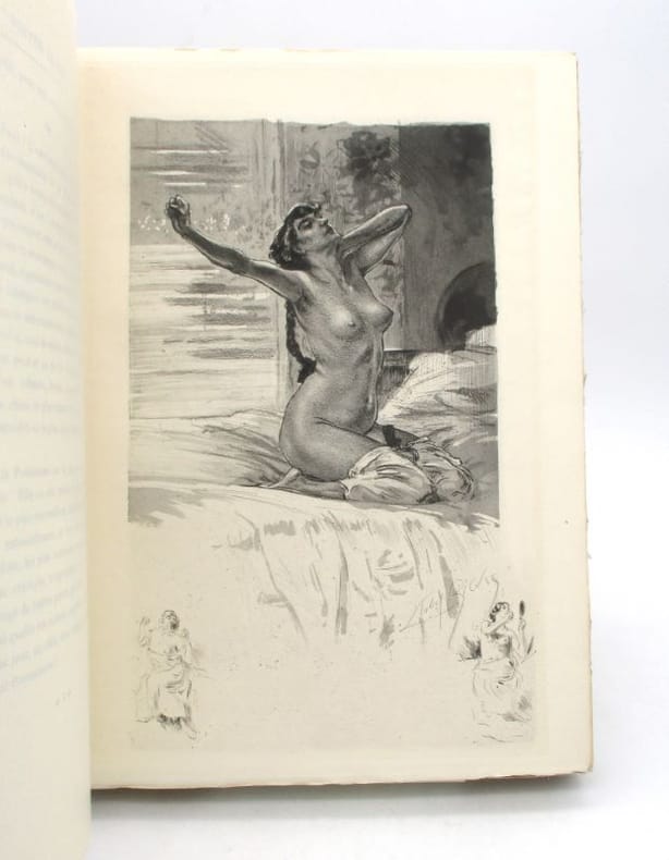 ÉDITION ORIGINALE de l'UNE DES MEILLEURES ILLUSTRATIONS de LOBEL-RICHE. Elle est ILLUSTRÉE d'un en-tête, d'un cul-de-lampe et de 38 hors-texte à pleine page légendés sous serpentes, soit 40 EAUX-FORTES originales gravées en taille-douce, assez lestes, par Alméry LOBEL-RICHE (1877-1950), peintre, graveur et illustrateur français connu pour ses représentations du monde des courtisanes et de la galanterie. Tirage limité à 300 exemplaires. UN des 178 numérotés sur vélin d’Arches (n°222). Exemplaire enrichi d'UNE LETTRE AUTOGRAPHE SIGNÉE de l'auteur (une page sur un feuillet double 157 X 105 mm), dans laquelle il demande à son correspondant de bien vouloir lui répondre « en quelques lignes » à la question « Quelle devrait être l'organisation d'un musée du Louvre idéal ? ». Il se recommande de l'écrivain Jean LORRAIN (1855-1906), qui est un ami commun aux deux hommes. Gustave COQUIOT (1865-1926), écrivain, auteur dramatique et critique d'art français, fut un des secrétaires d'Auguste Rodin et l'ami du peintre-décorateur de théâtre Lucien Jusseaume. Exemplaire en BEL ÉTAT. NICE COPY. PICTURES AND MORE DETAILS ON REQUEST.