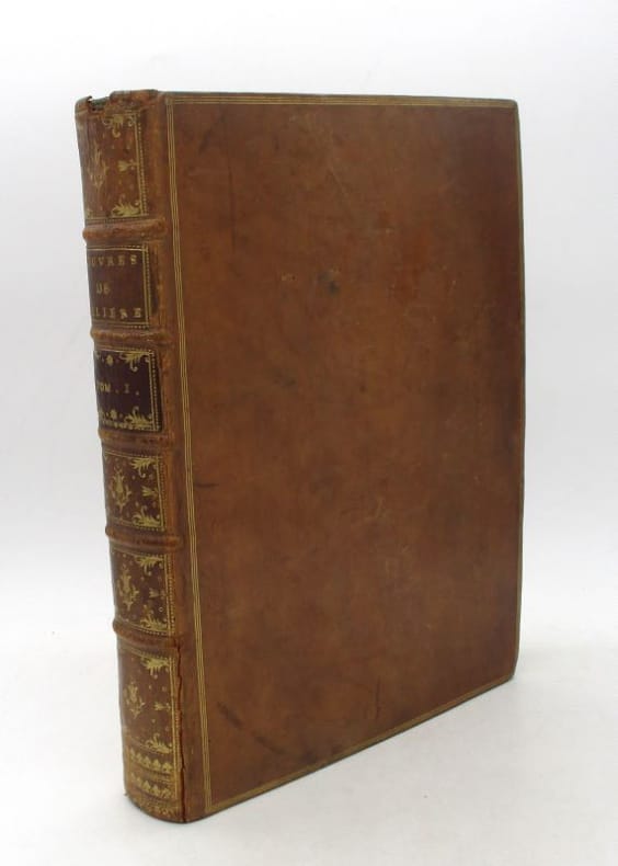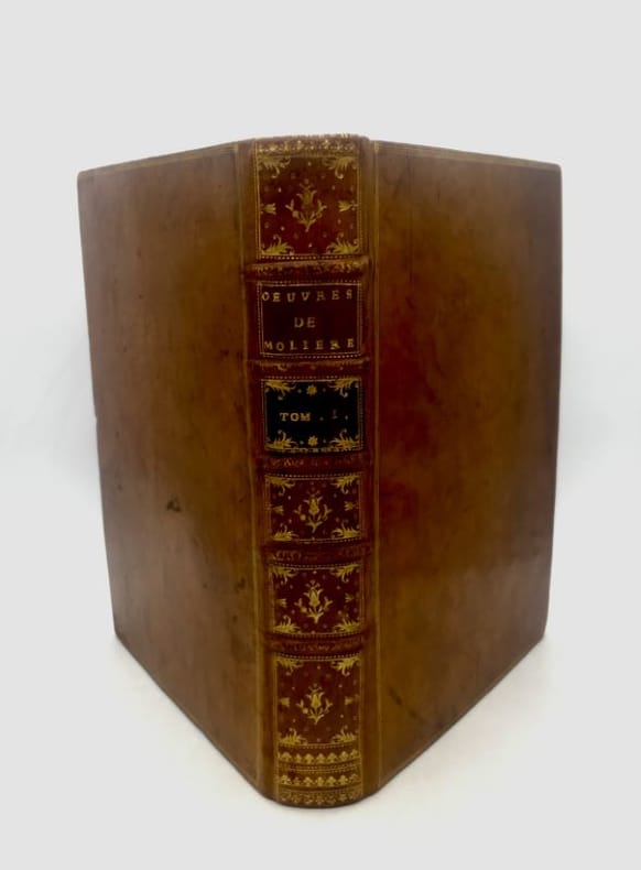 Reliure demi-veau fauve glacé. Dos lisses ornés de filets dorés. Trois tranches mouchetées. Reliure signée CAPE. Intérieur très propre.Tome I: Préface de l'Editeur - Vie de Molière - Histoire de la Troupe de Molière - L'ETOURDI , ou LES CONTRE-TEMPS, comédie en cinq actes - LE DEPIT AMOUREUX, comédie en cinq actes - Scène du DENIAISE de Gillet de la Tessonnière, imitée par Molière. - Tome II: LES PRECIEUSES RIDICULES, comédie en un acte - SGANARELLE, ou LE COCU IMAGINAIRE, comédie en un acte - DON GARCIE DE NAVARRE, ou LE PRINCE JALOUX - Fragment du PRINCIPE GELOSO de Cicognini, imité par Molière - L'ECOLE DES MARIS - LES FACHEUX. - Tome III: L'ECOLE DES FEMMES - LA CRITIQUE DE L'ECOLE DES FEMMES - L'IMPROMPTU DE VERSAILLES - LE MARIAGE FORCE - LA PRINCESSE D'ELIDE - LES PLAISIRS DE L'ILE ENCHANTEE. - Tome IV: DON JUAN, ou LE FESTIN DE PIERRE - DON JUAN, OU LE FESTIN DE PIERRE par Thomas Corneille - L'AMOUR MEDECIN - LE MISANTHROPE. - Tome V: LE MEDECIN MALGRE LUI - MELICERTE - PASTORALE COMIQUE - LE SICILIEN, ou L'AMOUR PEINTRE - LE TARTUFFE - AMPHITRYON. - Tome VI: L'AVARE, comédie en cinq actes - GEORGES DANDIN, ou LE MARI CONFONDU, comédie en trois actes - RELATION DE LA FETE DE VERSAILLES, du 18 juillet 1668 - MONSIEUR DE POURCEAUGNAC, comédie-ballet en trois actes. - Tome VII: LES AMANTS MAGNIFIQUES - LE BOURGEOIS GENTILHOMME - PSYCHE, tragédie-ballet. - Tome VIII: LES FOURBERIES DE SCAPIN - LA COMTESSE D'ESCARBAGNAS - BALLET DES BALLETS - LES FEMMES SAVANTES - LE MALADE IMAGINAIRE suivi de POESIES DIVERSES: SONNET à M. La Mothe-le-Vayer - LA GLOIRE DU DOME DU VAL-DE-GRACE. Tome IX: Discours sur la comédie et vie de Molière extraits de l'édition des oeuvres de Molière avec commentaires par M. Auger, Paris, Firmin Didot, 1827. Orné d'une carte généalogique dépliante. [Suivi de] Deux pièces inédites de J.-B. P. Molière, Paris, Th. Desoer, 1819.Sans le frontispice sur le tome I.