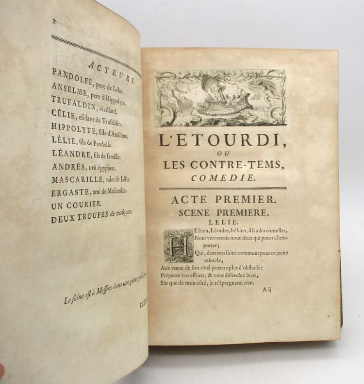 Broché sous couverture de papier fort, imprimé et remplié, Très bon état : papier non-découronné, quelques rares transferts des gravures (aplats noirs) sur les pages de texte en regard. Exemplaire complet de tous ses feuillets et de toutes ses serpentes (pour les ill. pleine page). Magnifique édition des oeuvres de Molière fruit d'une collaboration entre papetier, imprimeur, typographe, graveur et éditeur. L'abondance de gravures (lettrines, cul-de-lampe et bandeaux, illustrations pleine-page nombreuses et en plusieurs états) permet de qualifier cet ouvrage de remarquable. Précis témoignage de la 'Première des grandes fêtes données à Versailles par Louis XIV, [qui] voit aussi la première collaboration, sous l’égide du roi, de Molière et de Lully. Six jours qui établissent définitivement le mythe de Versailles comme lieu de réjouissances.' (site internet du château de Versailles).