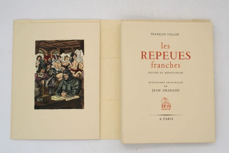 Paris Editions Eryx 1956 In-8, en feuilles, couverture imprimée (emboîtage de l'éditeur).12 illustrations hors texte en couleurs par Jean Gradassi. Tirage limité à 498 exemplaires numérotés. Un des 195 exemplaires sur vélin accompagnés d'une suite en noir avec remarques des illustrations tirées sur vélin. Exemplaire enrichi du prospectus de l'éditeur et d'une double suite (en couleurs et en noir) sur vélin de 4 planches inutilisées avec remarques.