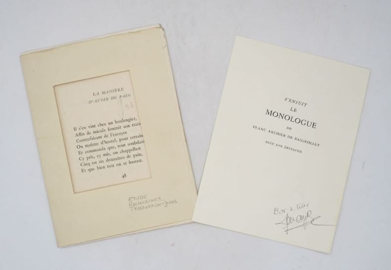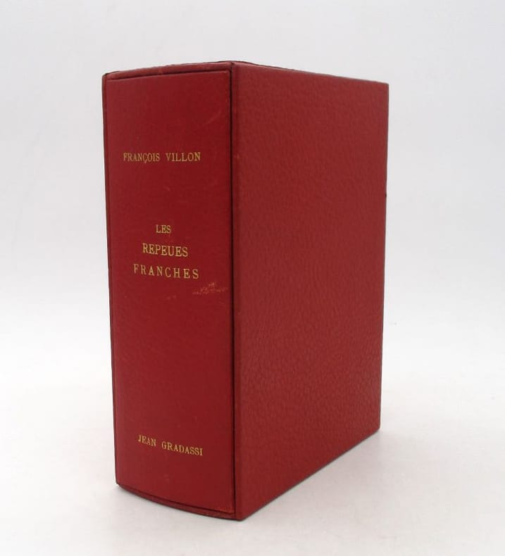 Édition illustrée des compositions rehaussées en couleurs de Jean Gradassi. Un des 8 exemplaires hors commerce sur Japon cotés A à H comprenant un dessin rehaussé en couleurs, un croquis libre à la mine de plomb, trois suites (un état en noir, un en rouge et un en bleu), un cuivre, deux suites des planches hors commerce avec remarques (un état en noir et un rehaussé de couleurs) les bons à tirer d'une planche, trait et couleurs ainsi qu'un échantillon typographique de plusieurs pages. * Membre du SLAM et de la LILA / ILAB Member. La librairie est ouverte du lundi au vendredi de 14h à 19h. Merci de nous prévenir avant de passer,certains de nos livres étant entreposés dans une réserve.