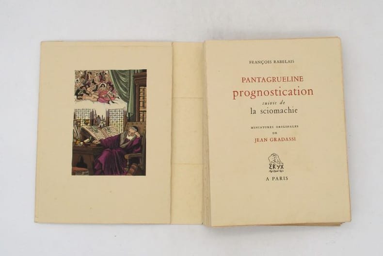 François Rabelais (également connu sous le pseudonyme de Alcofribas Nasier, anagramme de François Rabelais, ou bien encore sous celui de Séraphin Calobarsy) est un écrivain français humaniste de la Renaissance, né à la Devinière à Seuilly, près de Chinon (dans lancienne province de Touraine), en 1483 ou 1494 selon les sources, et mort à Paris le 9 avril 1553. Jean Gradassi est un illustrateur, peintre et miniaturiste français, né à Antibes le 8 avril 1907 et mort en avril 1989. Merci de nous contacter à l'avance si vous souhaitez consulter une référence au sein de notre librairie.