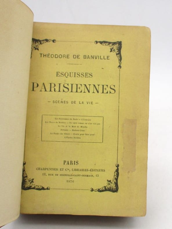 Edition Originale de ces délicieuses Chroniques Parisiennes , au demeurant l'un des ouvrages en prose les plus aboutis de Banville. BON ETAT Franco de port France jusqu'à 29 euros iclus. PAYPAL immédiat. MONDIAL RELAY pour : FRANCE, Portugal, Pologne, Espagne, Allemagne, Autriche, Pays Bas, Luxembourg, Italie, Belgique. Toutes les étapes sont accompagnées. Achat, estimations et listages (Papiers, Archives, monographies, arts et métiers, sciences humaines et bibliophilie) France / Suisse (sur rdv).