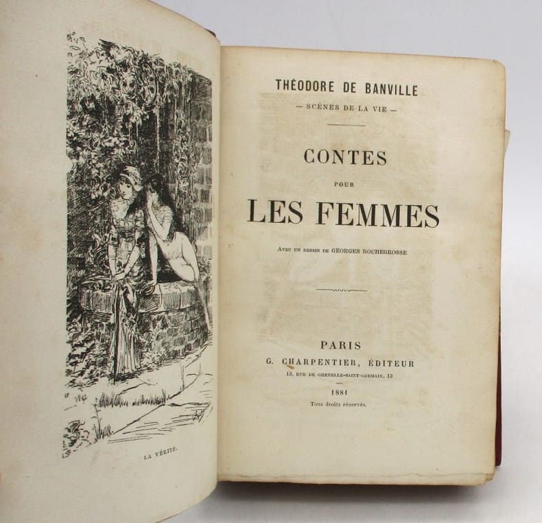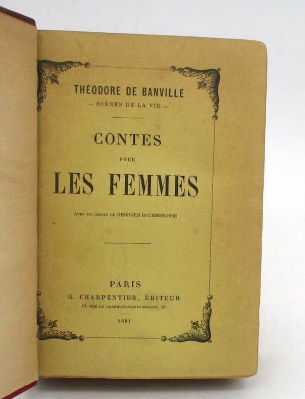 Paris Charpentier 1881 1 vol. relié in-12, demi-maroquin rouge à coins, dos à nerfs, tête dorée, couvertures et dos conservés, non rogné, III + 452 pp. Edition originale ornée d'un dessin en frontispice par Georges Rochegrosse. Bon exemplaire en reliure moderne, avec un envoi autographe signé de l'auteur à Claudius Popelin.
