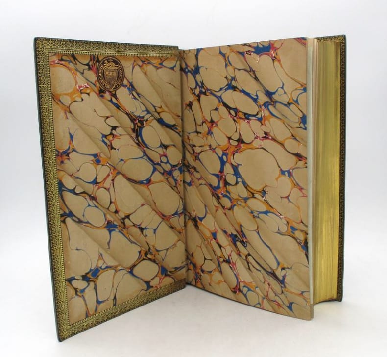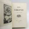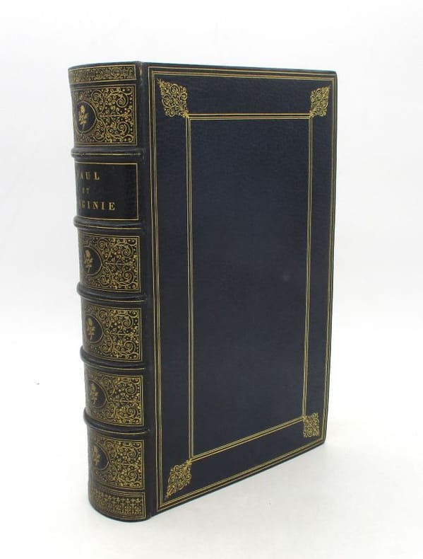 La plus luxueuse édition, en reliure de Simier Paris, De l'Imprimerie P. Didot l'aîné, 1806. 1 vol. (235 x 320 mm) de faux-titre, front., titre, xcii, 194 p. et [3] f. Maroquin bleu à long grain, plats à encadrements ornés de larges roulettes et filets à froid et dorés, dos richement orné, roulette intérieure, tranches dorées (reliure signée de Simier R. du Roi). La plus luxueuse édition illustrée de Paul et Virgnie, en partie originale et qui fixe le texte définitif. Elle est illustrée d'un portrait de l'auteur et de 6 planches hors texte, gravées sur cuivre par Bourgeois de la Richardière, Bovinet, Mecou, Prot, Ribault, Roger et Tillement.