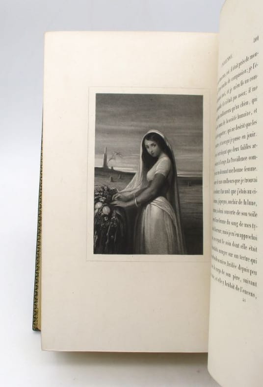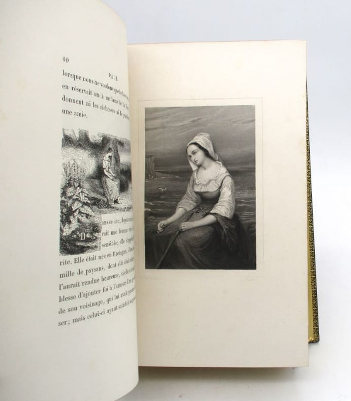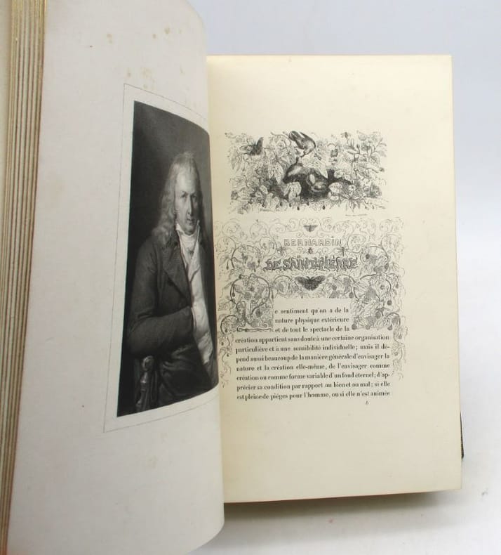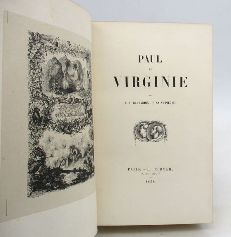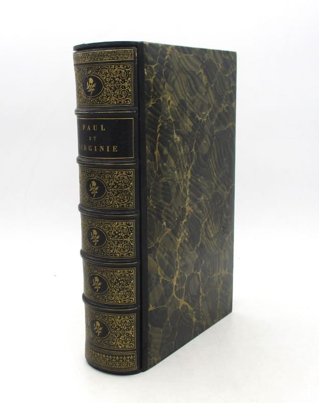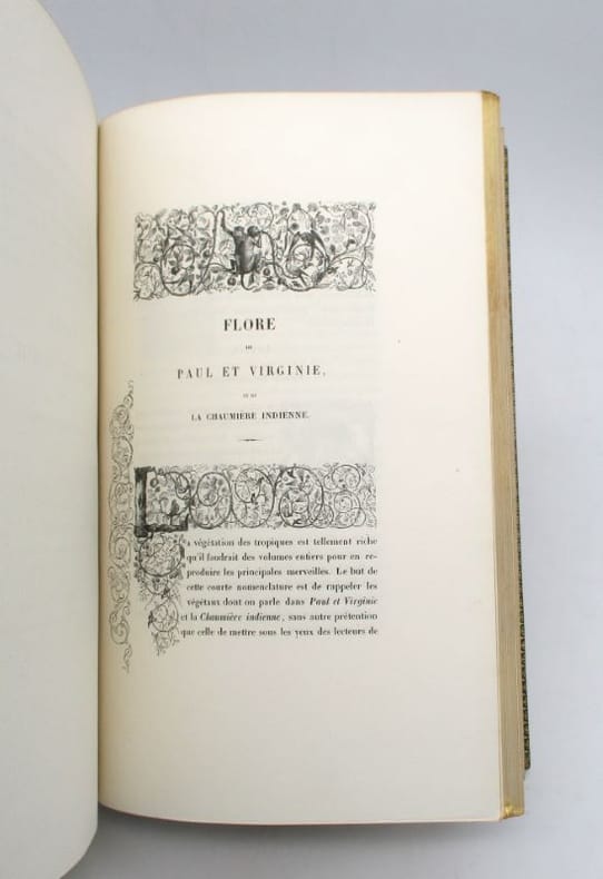 Exemplaire revêtu d'une reliure décorative du temps. Il s'ouvre sur un portrait-frontispice figurant l'auteur tiré sur Chine appliqué signé de Laffite. L'iconographie - outre de très nombreuses (environ 450) figures dans le texte et larges ornements typographiques figuratifs - est complétée par une carte de l'île Maurice sur Chine appliqué en coloris gommés, ainsi que 6 portraits sur Chine et 29 planches hors-texte. Réimpression de la célèbre édition Curmer de 1838, considérée telle l'une des meilleures productions de l'illustré romantique. Issus de deux familles différentes, Paul et Virginie sont élevés en commun comme frère et sœur, dans la splendeur naturelle des paysages tropicaux de lîle Maurice. Mais à l'adolescence, des sentiments amoureux naissent entre les deux personnages. La mère de Virginie, Madame de la Tour décide alors de l'éloigner de Paul en envoyant sa fille étudier en France, laissant Paul à son chagrin. Plusieurs années après, Virginie annonce son retour sur l'île, mais le navire qui la ramène de France est pris dans une tempête... Appartenant au registre pathétique, Paul et Virginie décrit avec force les sentiments amoureux et la nostalgie du paradis perdu. Au-delà du cadre exotique et de la description d'une société idyllique, Bernardin de Saint-Pierre expose dans ce roman sa vision pessimiste de l'existence. A la suite, est imprimé le texte intitulé ''Flore'', se proposant de décrire les principales espèces rencontrées au cours de la lecture de ''Paul et Virginie'' ainsi que de ''La Chaumière indienne''. Pour l'édition Curmer de 1838 : Vicaire VII, Manuel de l'amateur de l'amateur de livres du XIXème siècle, 71 - Carteret III, L eTrésor du bibliophile, p. 552. Angles élimés. Dos passé. Exception faite des planches sur Chine, l'ouvrage ne présente que peu de rousseurs.