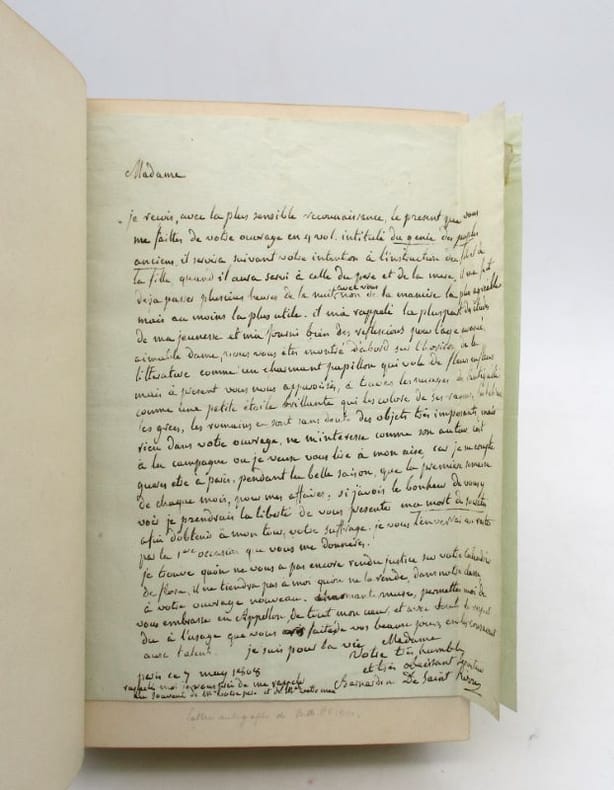 Belle édition illustrée d'un frontispice, d'une carte en couleurs et 76 planches hors-texte dont 8 sont en cinq état : un avant la lettre, un après la lettre avec légende, un état sans la légende, un état sur Chine appliqué avec la légende et un état sur Chine appliqué sans la légende, ainsi que d'environ 450 bois gravés dans le texte. Il sont gravés d'après les plus grands illustrateurs de l'époque : Johannot, Meissonier, Huet, Isabey ou encore Marville. Cet exemplaire comporte la gravure de la Jeune Bramine dite "à l'étoile" mais pas celle de la Bonne femme ainsi que la mention en fin de table "tous les grands dessins de la Flore sont de M. Français". IL comprend également une lettre autographe signée de l'auteur à Victorine de Chastenay (1 p. in-4 datée du mai 1808), célèbre mémorialiste, femme de lettre et traductrice française. Bernardin de Saint-Pierre la remercie pour l'envoi de son ouvrage intitulé "Du génie des peuples anciens" (paru chez Maradan en 1808) et lui fait mille compliment sur sa plume. Il évoque également le Le Calendrier de Flore, paru cinq ans plus tôt (elle est, comme lui, une botaniste avertie) et l'invite à venir le voir pour qu'il puisse lui montrer sa Mort de Socrate qui paraît cette même année. Vicaire, VII, 42; Carteret, p. 552. Ex-libris héraldique de John Delaware Lewis, politicien britannique du XIXe siècle. Très belle reliure de maroquin signée par Capé. * Membre du SLAM et de la LILA / ILAB Member. La librairie est ouverte du lundi au vendredi de 14h à 19h. Merci de nous prévenir avant de passer,certains de nos livres étant entreposés dans une réserve.