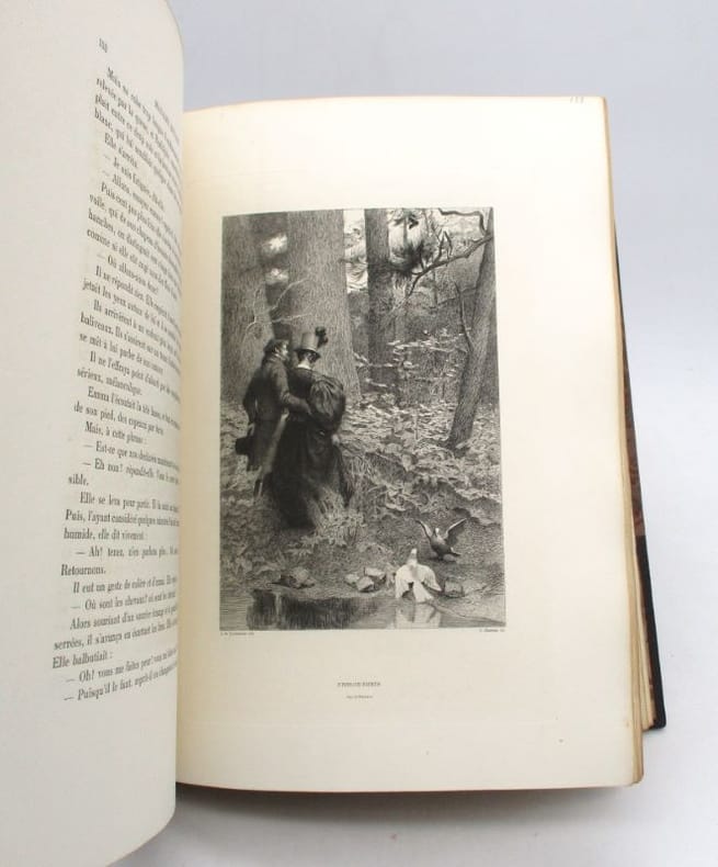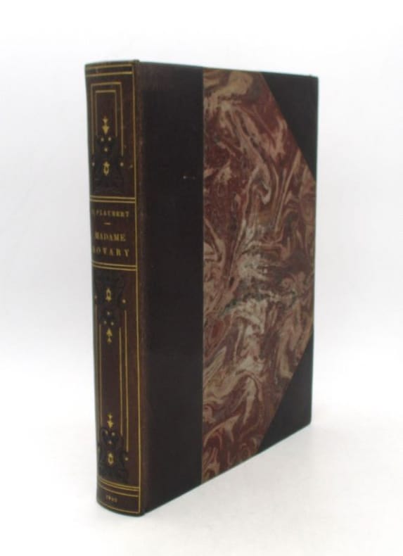 Paris, Michel Lévy frères [Typ. de Mme Ve Dondey-Dupré, rue Saint-Louis, 46], 1857, in-12, 2 volumes, [1] feuillet de dédicade, [1] faux-titre, 490 pages en numérotation continue, avec [1] feuillet de titre non compris dans la pagination en tête du tome II, Demi-chagrin aubergine de l'époque, dos à faux nerfs et fleuronnés, ÉDITION ORIGINALE en librairie, publiée après la parution en livraisons dans la Revue de Paris en 1856. PREMIER TIRAGE de l'édition ordinaire, contenant en tête du tome I la dédicace "à Marie-Antoine-Jules Sénart", c'est-à-dire Sénard, l'avocat qui défendit la cause célèbre de ce roman poursuivit par le parquet de la Seine pour outrage aux bonnes moeurs, orthographié avec un "t" final qui sera corrigé par le "d" dès le second tirage. En outre, on détermine l'origine de ce tirage en relevant quelques fautes non encore corrigées, dont: pages 50 et 67 non chiffrées ; page 145 (ligne 23), "demanda-t-elle" au lieu de "se demanda-t-elle" ; page 290 (ligne 25), il y a une virgule après "abîme" ; page 377 (21), impression mauvaise du premier mot "Puis" ; etc. (Piclin). "C'est associé à celui de Madame Bovary que le nom de Flaubert apparut pour la première fois sur une couverture" (En français dans le texte). Ce chef-d'oeuvre immense rassemble à lui trop de qualificatifs pour que l'on puisse ici en faire l'étalage. Retenons néanmoins quelques phrases d'un autre monument de la littérature française, Émile Zola, dans le Le Messager de l'Europe (novembre 1875): "Quand Madame Bovary parut, il y eut toute une évolution littéraire. Il sembla que la formule du roman moderne, éparse dans l'oeuvre colossale de Balzac, venait d'être réduite et clairement énoncée dans les quatre cents pages d'un livre. Le code de l'art nouveau se trouvait écrit. Madame Bovary avait une netteté et une perfection qui en faisaient le roman type, le modèle définitif du genre. Il n'y avait plus, pour chaque romancier, qu'à suivre la voie tracée, en affirmant son tempérament particulier et en tâchant de faire des découvertes personnelles. Certes, les conteurs de second ordre continuèrent à battre monnaie avec leurs histoires à dormir debout ; les écrivains qui se sont taillés une spécialité en amusant les dames n'abandonnèrent pas leurs récits à l'eau de rose. Mais tous les débutants de quelque avenir reçurent une profonde secousse ; et il n'en est pas un aujourd'hui, parmi ceux qui ont grandi, qui ne doive reconnaître tout au moins un initiateur en Gustave Flaubert. Il a, je le répète, porté la hache et la lumière dans la forêt parfois inextricable de Balzac. Il a dit le mot vrai et juste que tout le monde attendait." Il manque le faux-titre du tome II. Couvertures non conservées. Sans le catalogue éditeur qui terminait le tome I. Petit accroc réparé et petite tache brune au feuillet de dédicace. Dos insolés. Carteret, I, 263-266. Clouzot, 121. En Français dans le texte, 277. G.-R. Piclin, "L'Édition originale de Madame Bovary". Les Amis de Flaubert. Année 1960, Bulletin n° 16, p. 54 [En ligne]. Vicaire III, 721-723. Couverture rigide