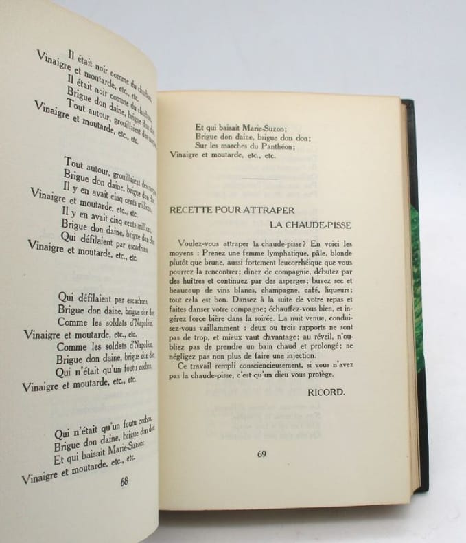 Sans lieu, ni mention d'éditeur et de date - "Cet ouvrage, à tirage limité, réservé aux seuls souscripteurs, n'a pas été mis dans le commerce" - 2 volume 14,5x21cm brochés sous couvertures rempliées de 361 et 296 pages sur papier vergé ivoire - Recueil de plus de 400 chansons et récits anonymes ou signés - couvertures légèrement insolées sinon bon état -