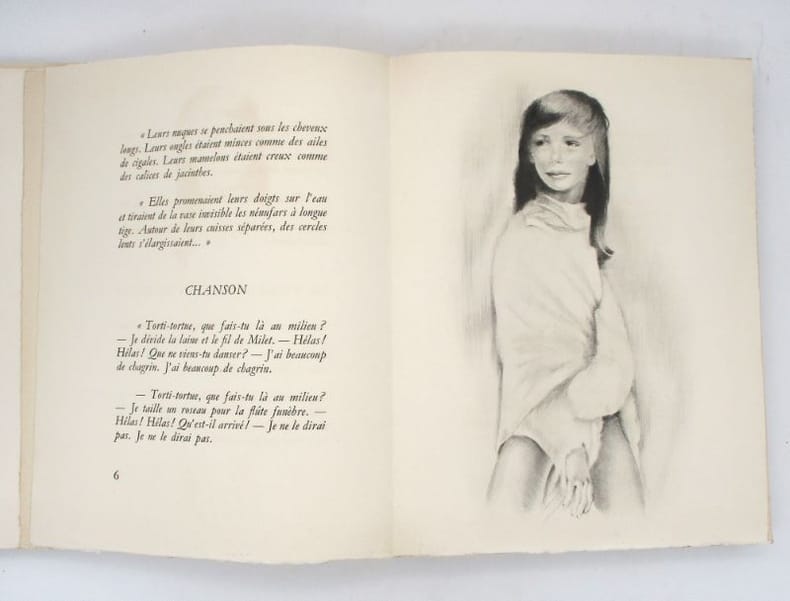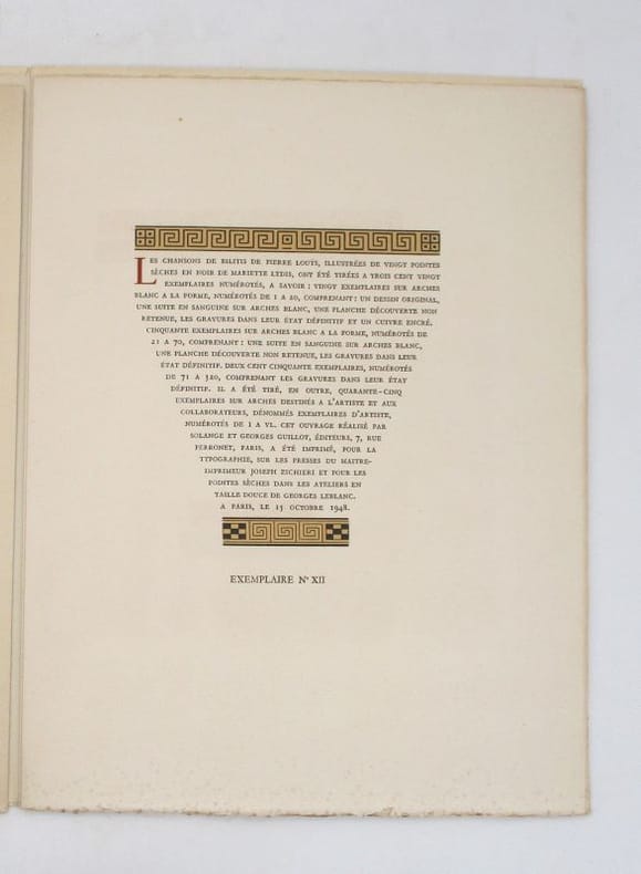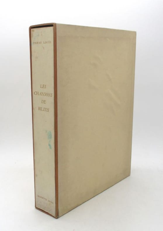Les Chansons de Bilitis est une uvre poétique publiée en 1894. L'ouvrage se donne comme une traduction du grec, due à Pierre Louÿs, de l'uvre d'une poétesse antique du nom de Bilitis, à laquelle sont attribués ces poèmes érotiques et passionnés. L'ouvrage est précédé d'une Vie de Bilitis, retracée par le traducteur et accompagnées de plusieurs pages de notes. En fait, les poèmes sont bien de la main de Pierre Louÿs. Merci de nous contacter à l'avance si vous souhaitez consulter une référence au sein de notre librairie.