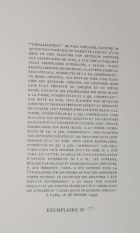 Parallèlement de Paul Verlaine chez Edito-Service S.A en 1977. Édition en fac-similé sur papier bouffant numéroté 2870 avec sa suite des reproductions des lithographies de Pierre Bonnard pour illustrer parallèlement de Paul Verlaine. Le livre est illustré de Lithographies originales de Pierre Bonnard. Le livre mesure 25x30 cm et pèse 2,500 kg (c) pour 137 page. En feuilles sous une même chemise et étui . Le livre est en très bon état.