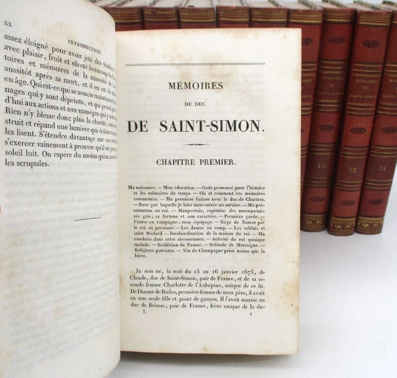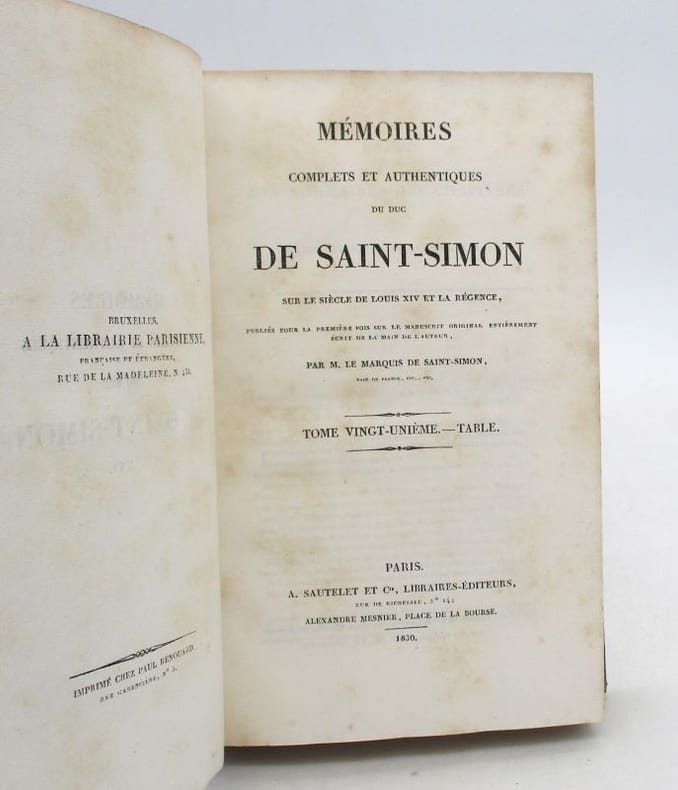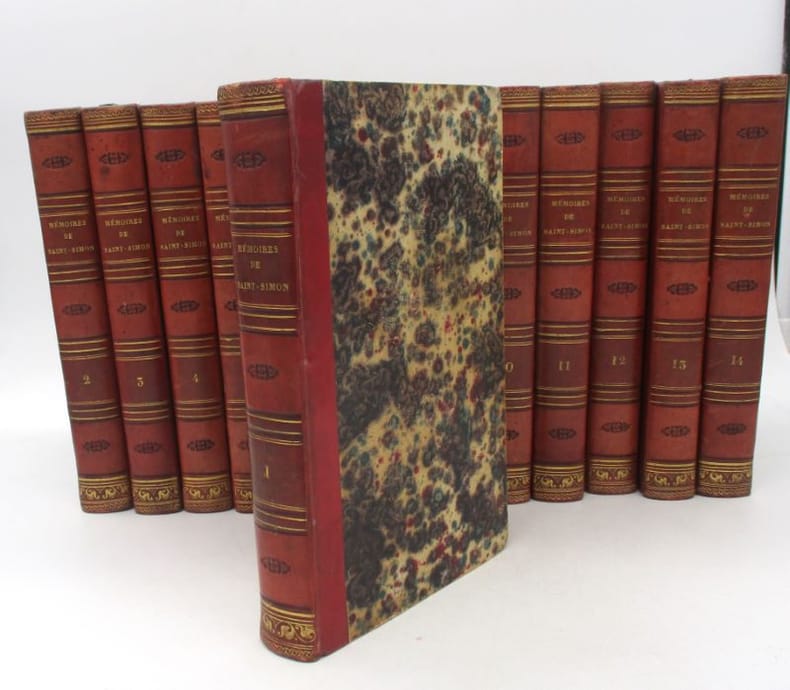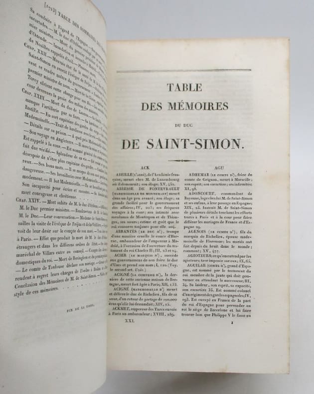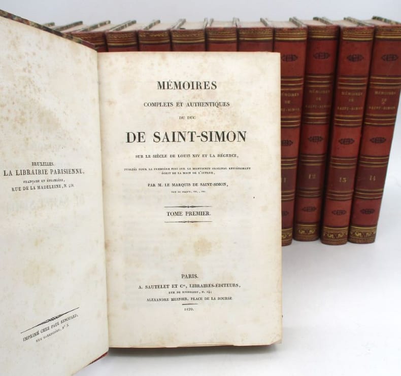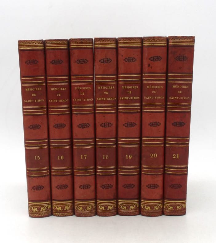 Première édition complète des célèbres Mémoires, établie par le marquis de Saint-Simon. Elle comprend un portrait de l'auteur en frontispice du 20e volume et le grand plan dépliant de la grande chambre du Parlement de Paris au 11e. Le manuscrit original du texte avait été saisi par le duc de Choiseul au décès de l'auteur et divers extraits en avaient été publiés. Ce fut finalement Louis XVIII qui les rendit à la famille, ce qui permit la présente parution. Elle fit grand bruit à son époque et entraîna de nombreuses rééditions et traductions. * Membre du SLAM et de la LILA / ILAB Member. La librairie est ouverte du lundi au vendredi de 14h à 19h. Merci de nous prévenir avant de passer,certains de nos livres étant entreposés dans une réserve.