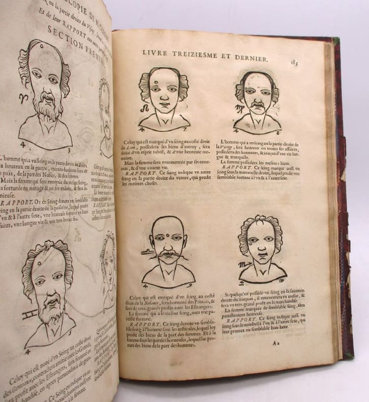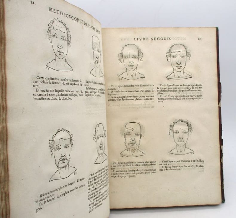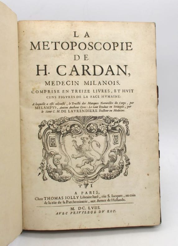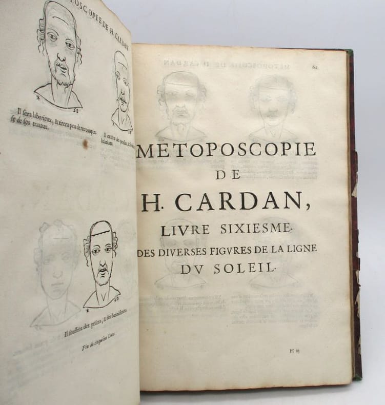 Édition originale posthume de la traduction française par Claude-Martin de Laurendière de ce traité illustré d'environ 800 bois gravés de figures humaines et destiné à l'enseignement de la métoposcopie. Il y décrit cette forme de divination de la personnalité et du futur d'une personne se fondant sur l'observation du visage, et plus particulièrement des rides du front. La technique est inventée par Jérôme Cardan lui-même au cours du XVIe siècle mais le texte n'est publié qu'un siècle plus tard. Il a paru une version latine de façon simultanée et toutes deux, bien que bien représentées en institutions sont assez rares sur le marché. Brunet, I, 550; Caillet, I, 2019 : "Traité fort rare [...] et qui ne se trouve point dans la collection des oeuvres de Cardan". * Membre du SLAM et de la LILA / ILAB Member. La librairie est ouverte du lundi au vendredi de 14h à 19h. Merci de nous prévenir avant de passer,certains de nos livres étant entreposés dans une réserve.