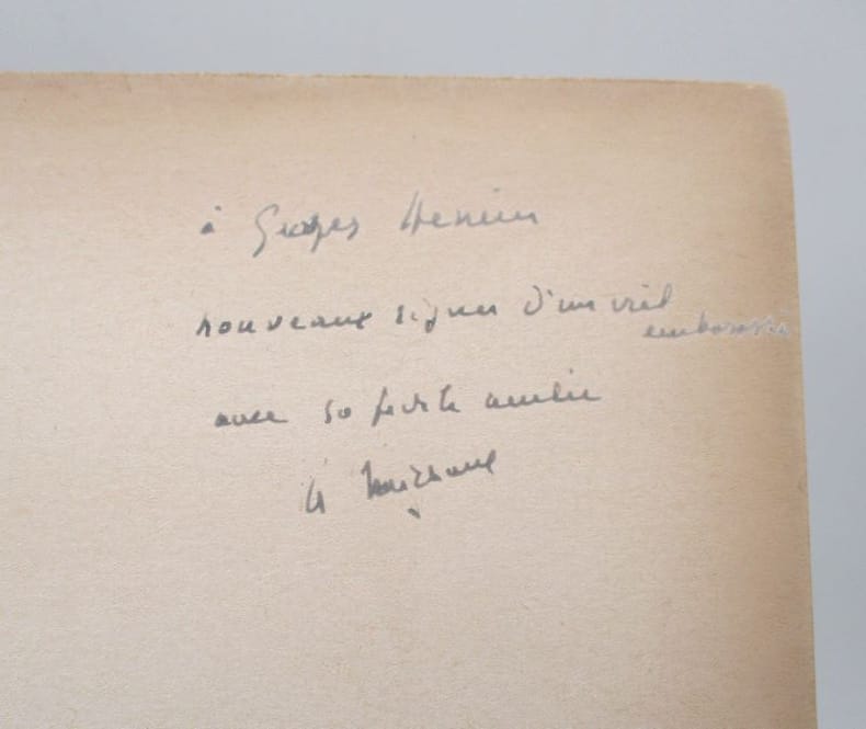 Édition originale illustrée. Un des 1200 exemplaires sur vélin spécial mat des papeteries Téka. Cet exemplaire comporte un envoi autographe signé de l'auteur à Georges Henein, un auteur et journaliste égyptien d'expression française. * Membre du SLAM et de la LILA / ILAB Member. La librairie est ouverte du lundi au vendredi de 14h à 19h. Merci de nous prévenir avant de passer,certains de nos livres étant entreposés dans une réserve.