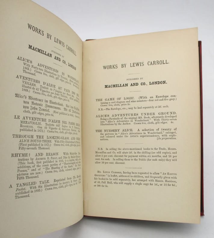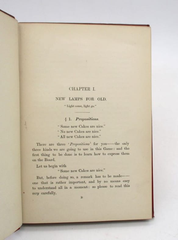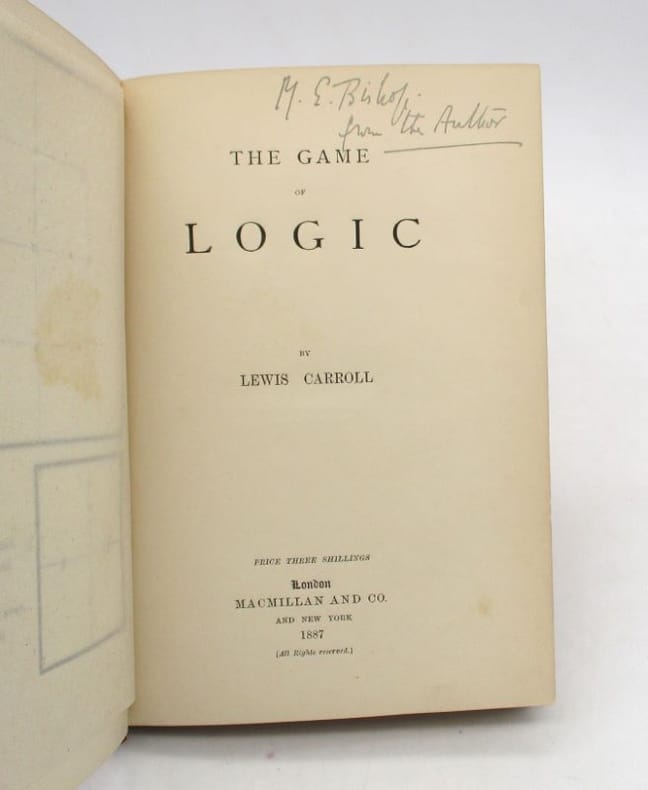 Nouvelle édition, parue l'année suivant l'originale, de ce recueil de jeux de logique. Cet exemplaire comporte un envoi autographe de l'auteur à E. Bishop. Complet du catalogue des oeuvres de Lewis publiée chez MacMillan and Co. * Membre du SLAM et de la LILA / ILAB Member. La librairie est ouverte du lundi au vendredi de 14h à 19h. Merci de nous prévenir avant de passer,certains de nos livres étant entreposés dans une réserve.