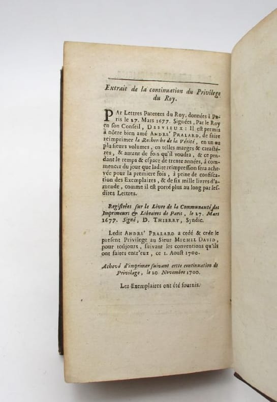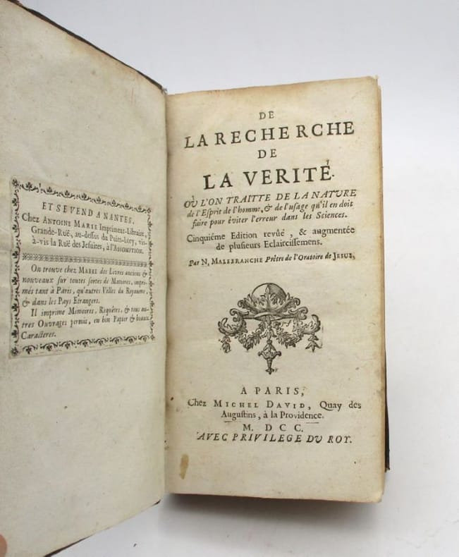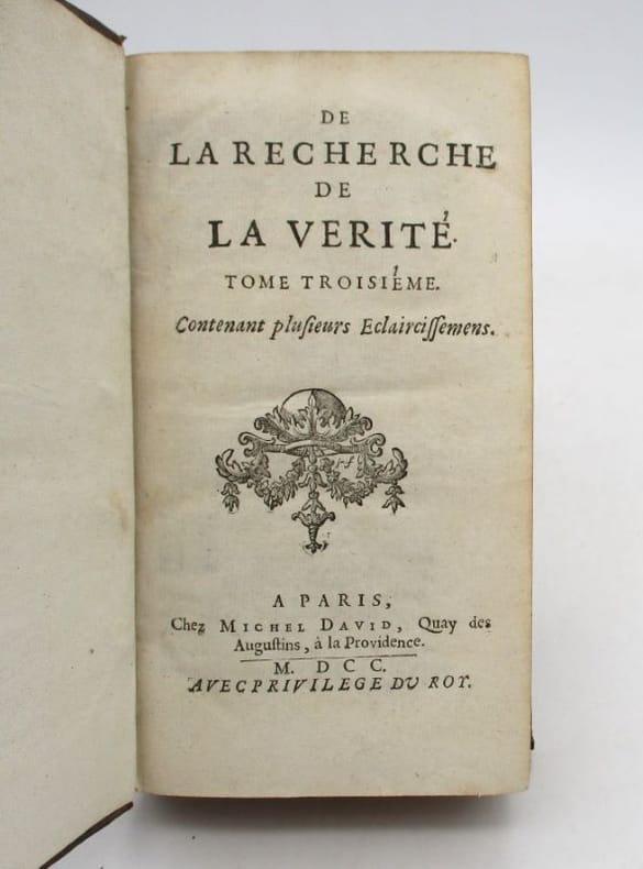 Cinquième édition revue et augmentée d'Éclaircissements par l'auteur : "[...] de toutes les éditions qu'on a faites de la Recherche de la vérité à Paris & ailleurs, celle-ci est la plus exacte & la plus ample [...] j'ai cru en devoir retrancher, ou y expliquer plus clairement que je n'avais fait, quelques endroits équivoques & obscurs." Elle est orné de vignettes gravées dans le texte, dont certaines à pleine page. Étiquette de la librairie nantaise Antoine Marie. * Membre du SLAM et de la LILA / ILAB Member. La librairie est ouverte du lundi au vendredi de 14h à 19h. Merci de nous prévenir avant de passer,certains de nos livres étant entreposés dans une réserve.