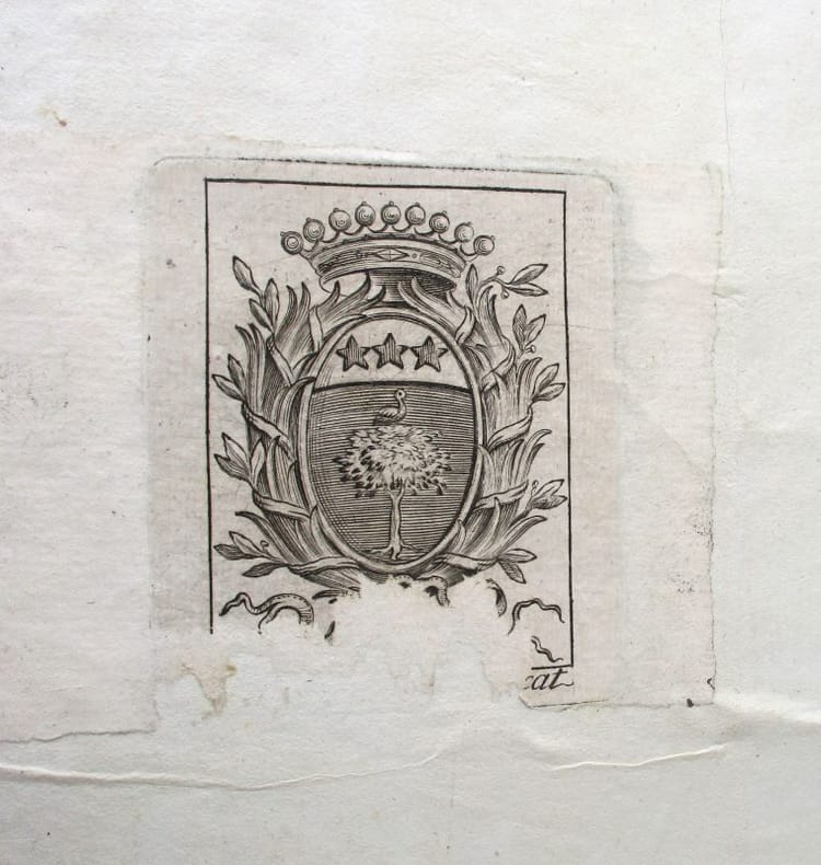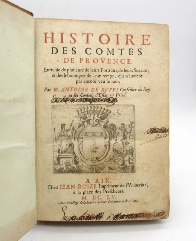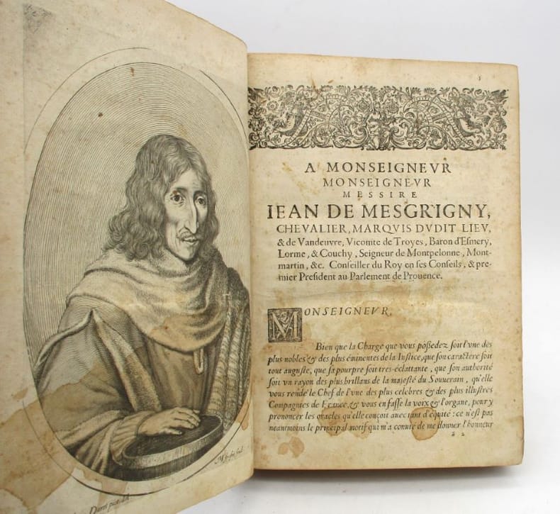 Aix, Jean Roize, 1655. 2 parties en 1 grand in-4, 18-412 pp. 1 pl., basane blonde marbrée, dos à nerfs orné de fleurons dorés, pièce de titre rouge, tranches mouchetées (reliure un peu défraîchie mais solide, partie inférieure de l'ex-libris arrachée, petite déchirure avec atteinte sans gravité pour la lecture aux ff. K1 et O3, importantes mouillures, rousseurs, quelques taches)