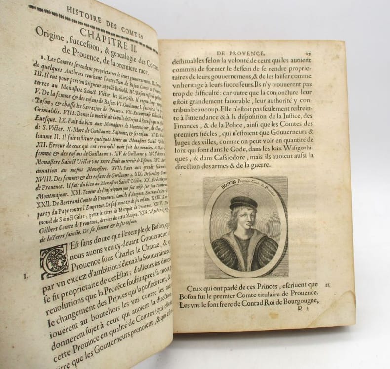 Deuxième édition de cette monographie historique dont l'originale a paru l'année précédente. Elle est ornée d'une belle vignette au titre, d'un portrait de l'auteur en frontispice gravé par Jean Frosne d'après Jean Daret. Il comprend également 29 portraits gravés par Frosne dont 2 de femmes : Adelle, mère de Guillaume III et Jeanne reine de Naples et comtesse de Provence ainsi que trois de couples : Gilbert Ier et Tiburge, Charles Ier et Béatrix, Louis Ier et Marie de Blois. Enfin, il comporte 12 planches de sceaux, monnaies et blasons . Brunet, IV, 145 : "Volume rare"; Ex-libris héraldique non identifié, ex-libris manuscrits biffés au titre. * Membre du SLAM et de la LILA / ILAB Member. La librairie est ouverte du lundi au vendredi de 14h à 19h. Merci de nous prévenir avant de passer,certains de nos livres étant entreposés dans une réserve.