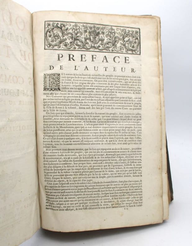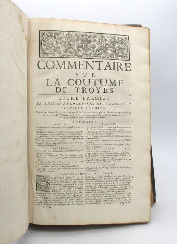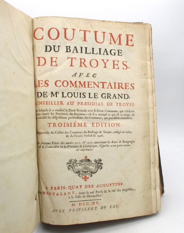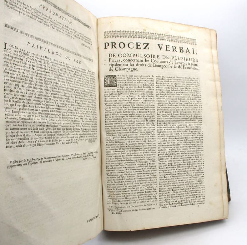 ,Paris, Montalant 1737, [6]-396-384-[64]-XXV pp., 1 vol. in folio relié dans lesquels il a conferé le Droit romain avec le Droit coutumier, qui s'observe dans toutes les provinces du Royaume ; où il a marqué ce qui est en usage, et a concilié les dispositions particulières des coutumes, qui paroissent contraires. Quatrième édition augmentée du Cahier des Coutumes du Bailliage de Troyes, rédigé en 1494 et du Procès Verbal de 1496. Et de plusieurs pièces des années 1507 & 1509 concernant les droits de Bourgeoisies et de Franc-aleu en la Province de Champagne, lesquelles n'ont point encore été imprimées. Reliure pleine basane fauve, dos à 6 nerfs orné de caissons et petits fers dorés, pièce de titre en maroquin rouge, titre doré, tranches rouges (reliure de l'époque), habiles restaurations aux coiffes et aux mors, traces anciennes d'humidité en marge au début et à la fin du livre,